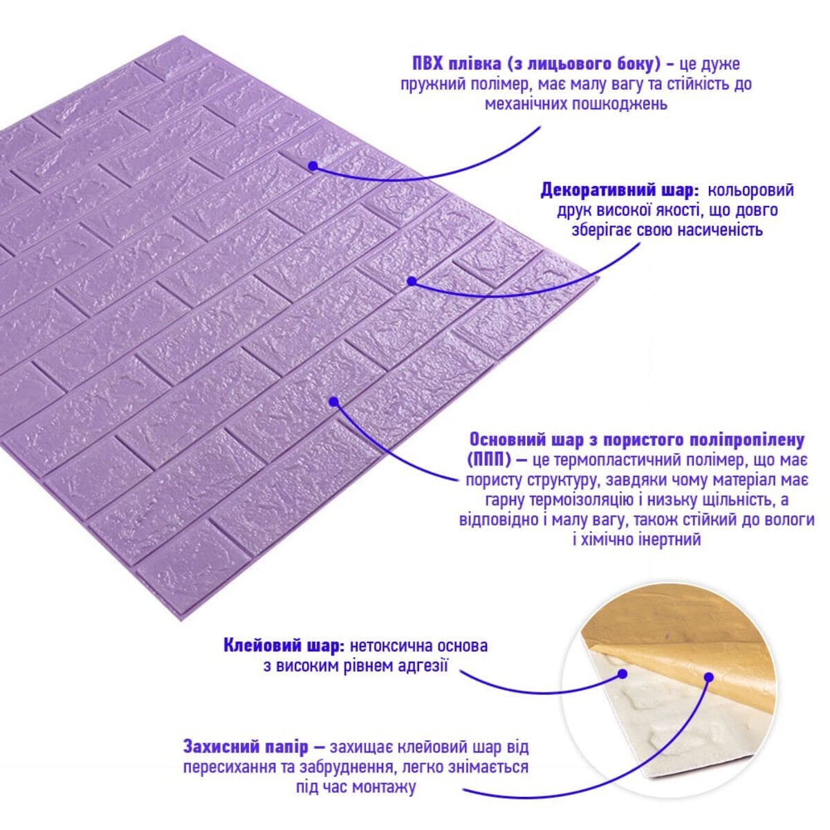 - Захисний папір – оберігає клейовий шар від пересихання та забруднення, легко знімається під час монтажу.
