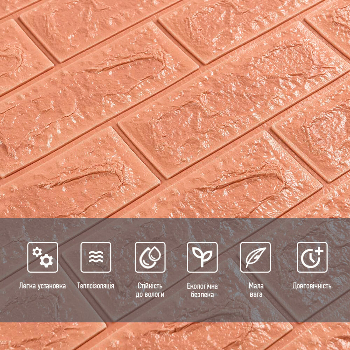 3D панелі самоклеючі – декоративне покриття для стін, виконане з легкого та міцного матеріалу – пористого поліпропілену (ППП). Основна особливість – рельєфний малюнок у вигляді цегли у широкому різноманітті кольорів та наявність клейового шару, що дозволяє встановити панелі без необхідності застосування додаткових матеріалів.