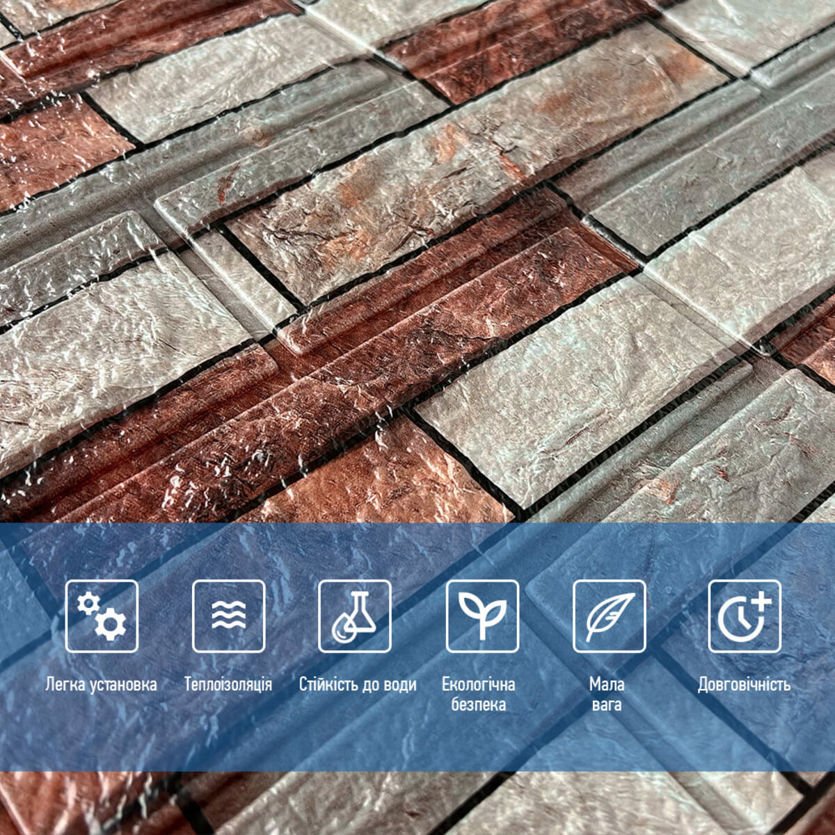 - Легкість монтажу: наявність клейового шару дозволяє встановити панелі без необхідності застосування додаткових матеріалів.
