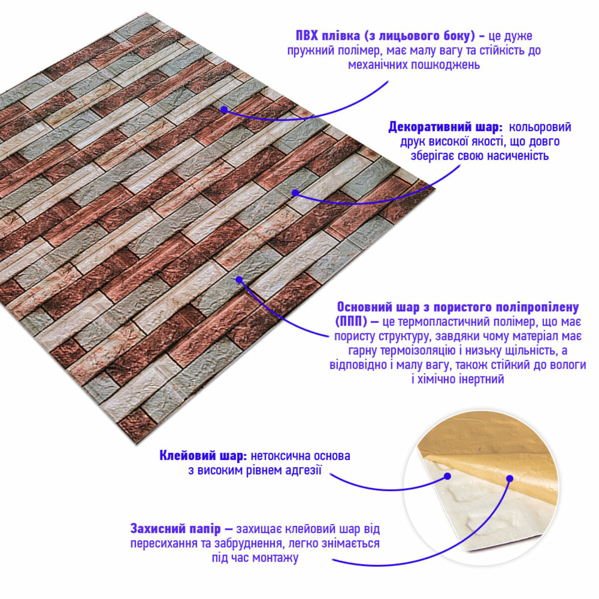 - Захисний папір – оберігає клейовий шар від пересихання та забруднення, легко знімається під час монтажу.