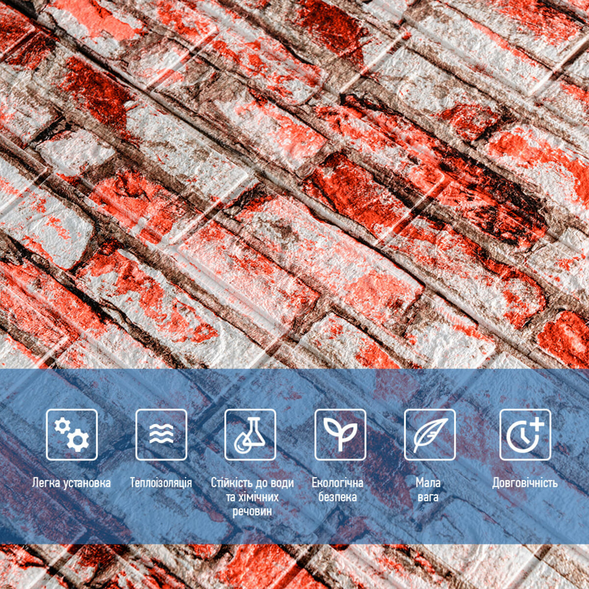 3D панелі самоклеючі – декоративне покриття для стін, виконане з легкого та міцного матеріалу – пористого поліпропілену (ППП). Основна особливість – рельєфний малюнок у вигляді цегли у широкому різноманітті кольорів та наявність клейового шару, що дозволяє встановити панелі без необхідності застосування додаткових матеріалів.