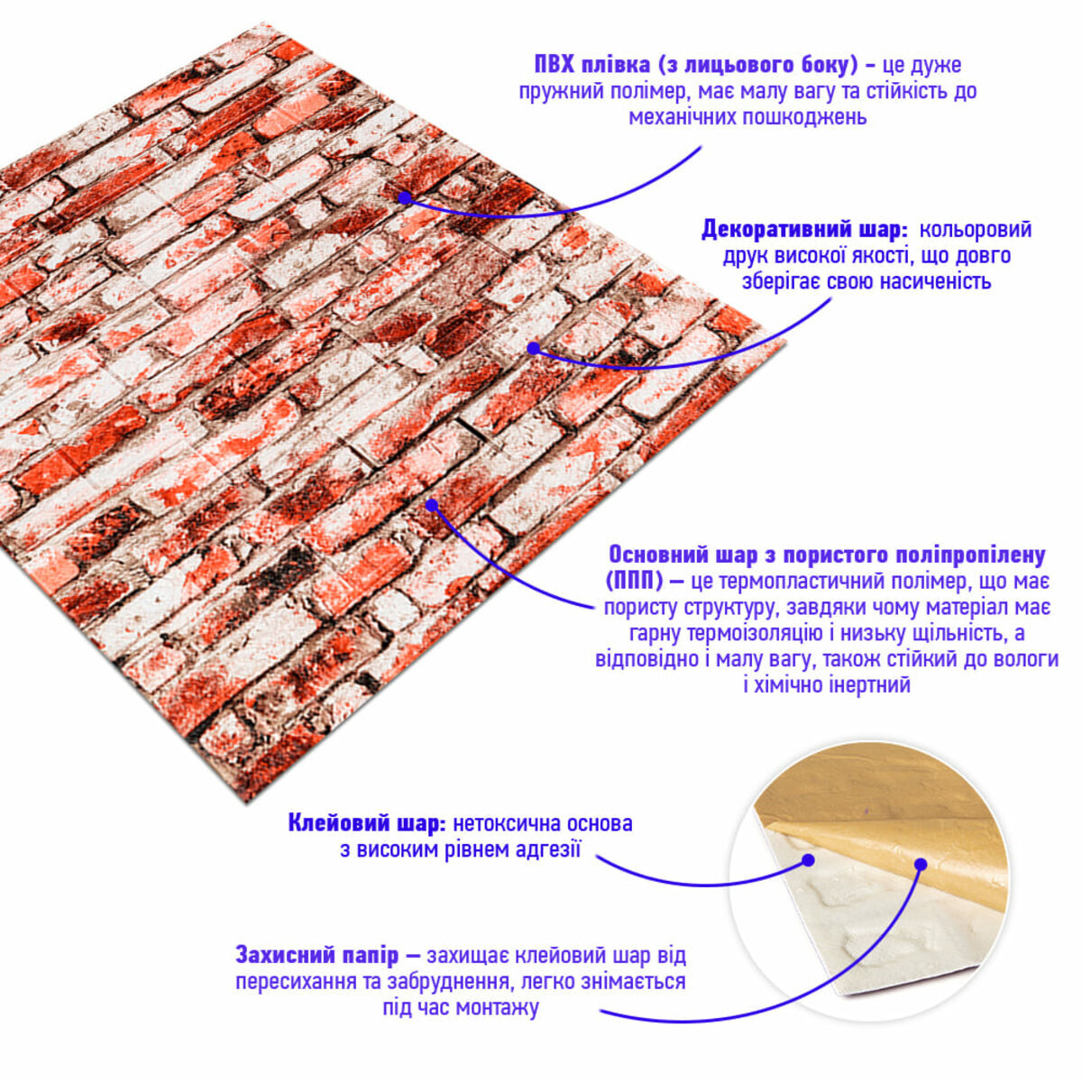 - Захисний папір – оберігає клейовий шар від пересихання та забруднення, легко знімається під час монтажу.
