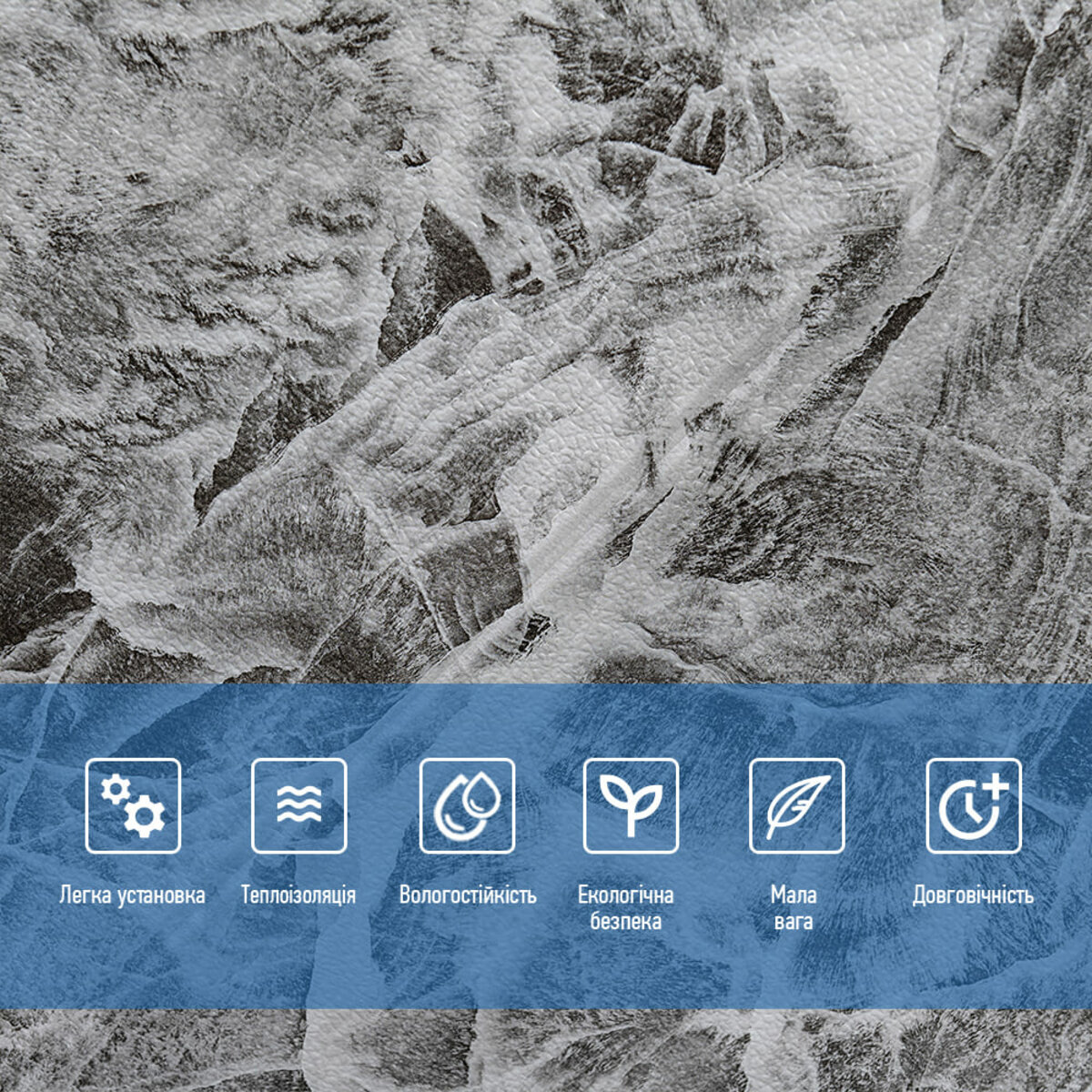 Декоративна панель під мармур виготовлена із спіненого поліпропілену. Це універсальний і щільний матеріал, але водночас легкий. Його термін служби понад 20 років. Самоклеючі 3D панелі з поліпропілену - це швидкий ремонт з мінімумом шуму та будівельного сміття.