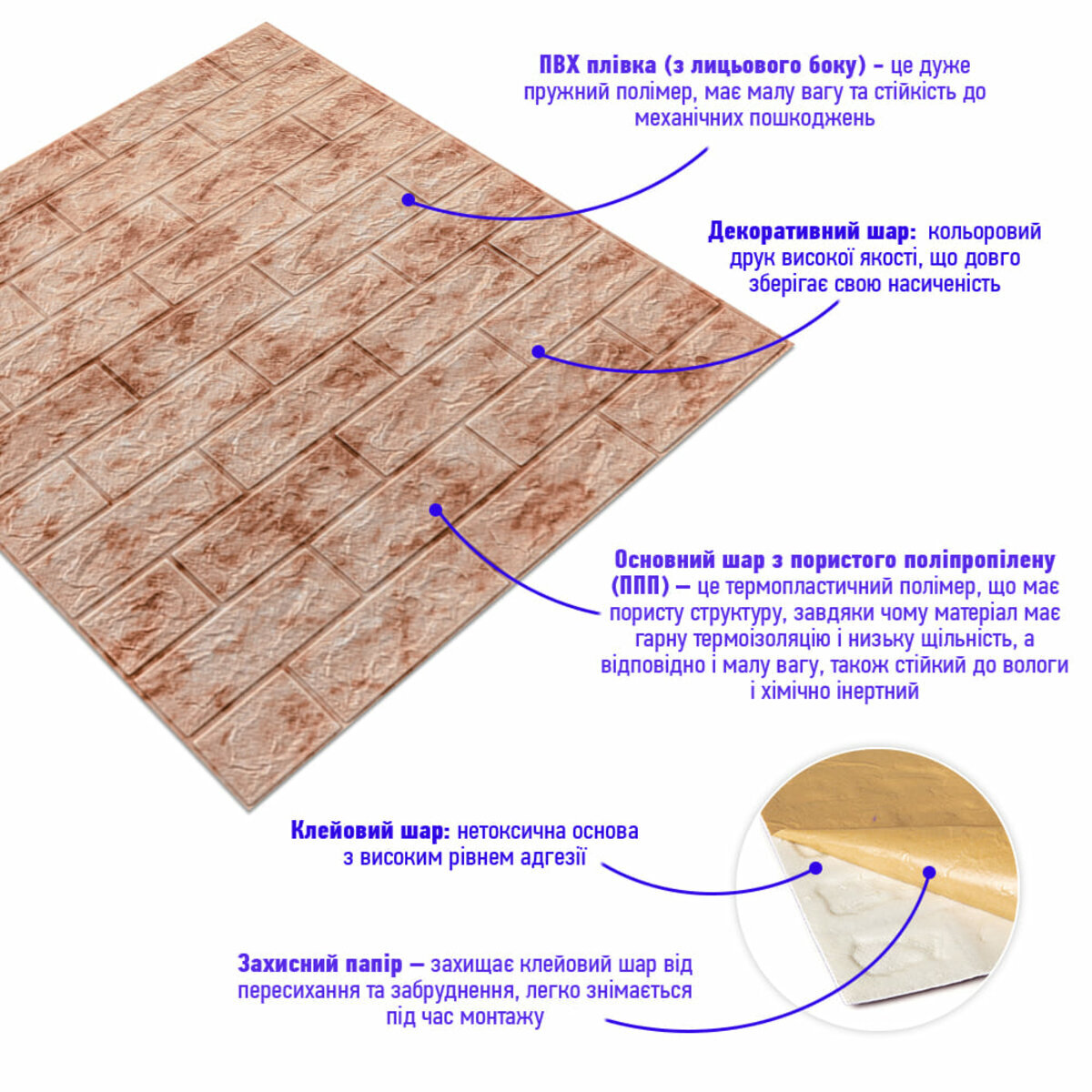 Декоративна панель під мармур виготовлена із спіненого поліпропілену. Це універсальний і щільний матеріал, але водночас легкий. Його термін служби понад 20 років. Самоклеючі 3D панелі з поліпропілену - це швидкий ремонт з мінімумом шуму та будівельного сміття.