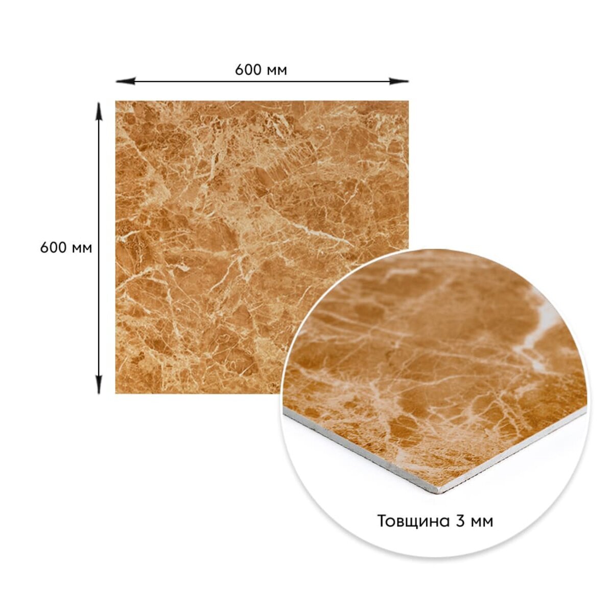 Розмір ПВХ плити - 600ммх600мм. Товщина - 3 мм. Вага листа - 2,4кг