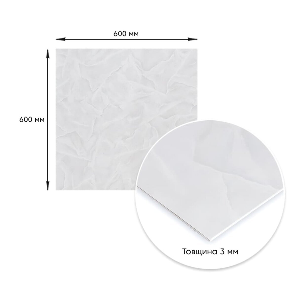 Розмір ПВХ плити - 600ммх600мм. Товщина - 3 мм. Вага листа - 2,4кг