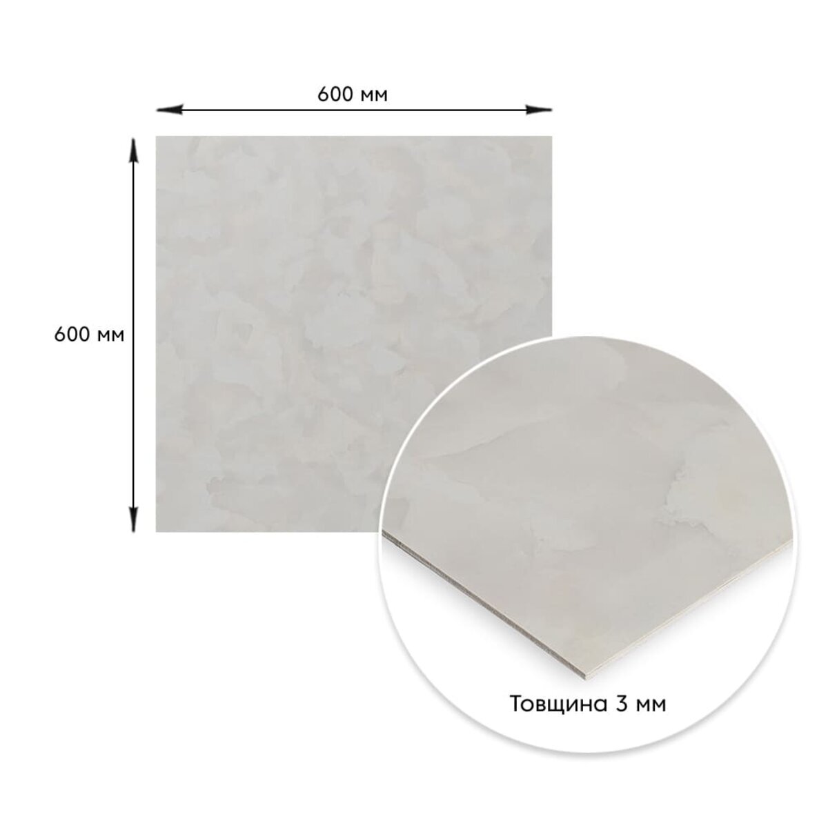 Розмір ПВХ плити - 600ммх600мм. Товщина - 3 мм. Вага листа - 2,4кг
