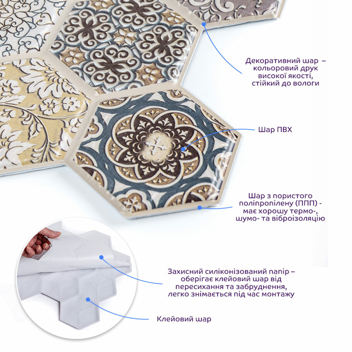 Самоклеючі декоративні панелі СПП - новинка у світі самоклейок. Це невеликі плитки із трендовим малюнком під натуральні матеріали. Прозорий захисний шар із поліуретану захищає покриття від стирання та механічних пошкоджень.