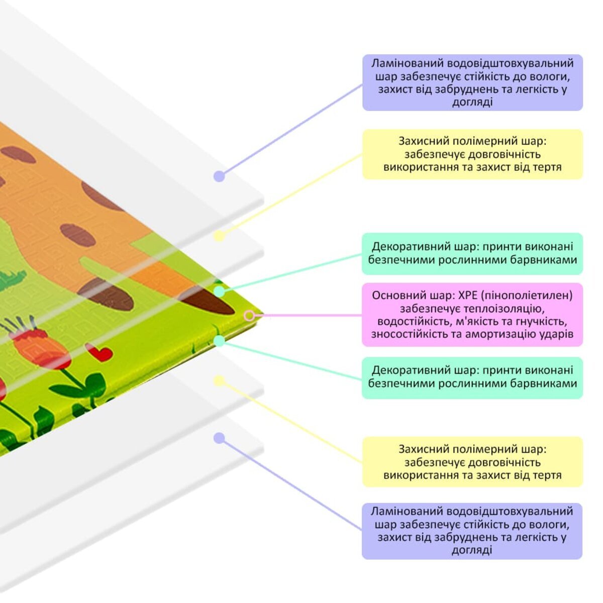 Основний матеріал килимка – спінений поліуретан (ХРЕ). Цей матеріал широко застосовується, він має термоізоляційний ефект, тобто не пропускає холод, а також не викликає алергію. Верхнє покриття килимка - харчова плівка, яка робить килимок вологостійким і захищає малюнок від зносу.