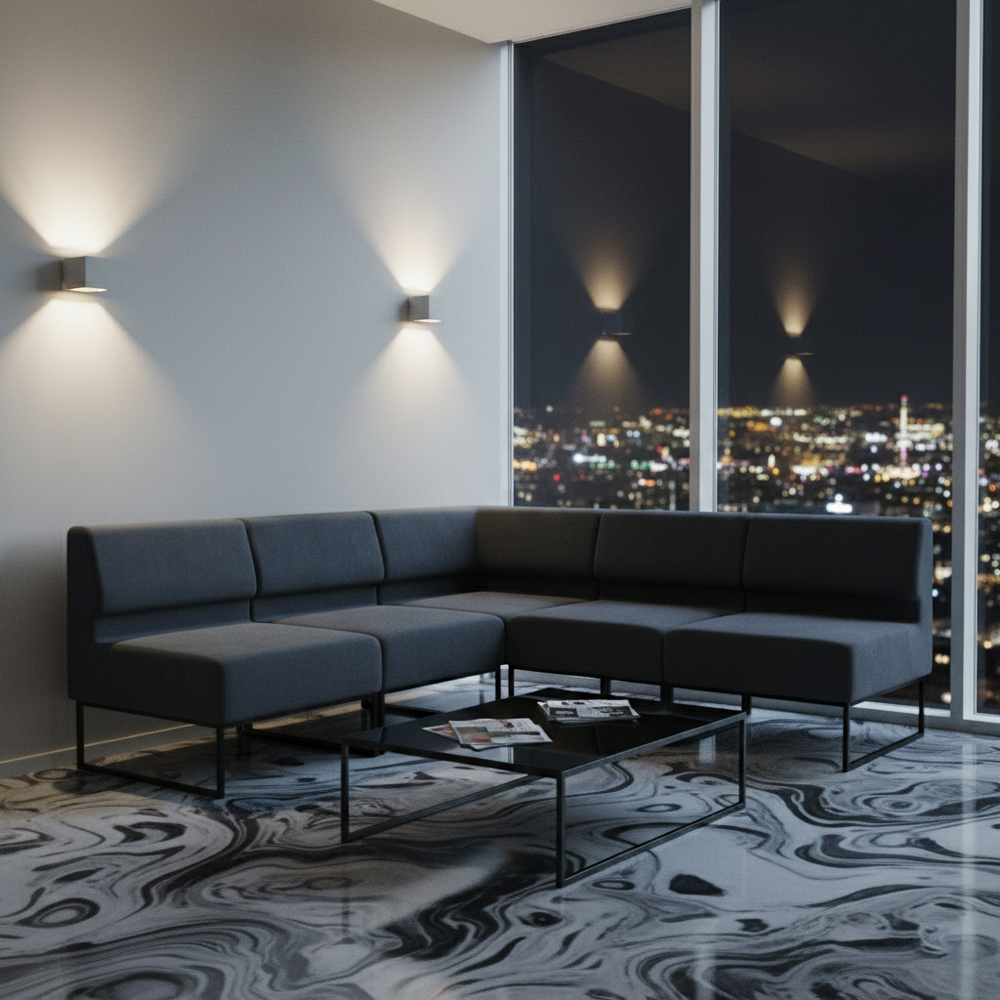 Richman Лаунж є сучасною модульною системою диванів, оформленою в стилі лофт-меблів. Використовуючи цю систему, ви без проблем зможете оформити потрібний вам простір стильними та комфортними меблями. Диван Лаунж виробляється у двох модифікаціях – одинарний модуль та кутовий. Кожна модифікація може бути зі спинкою або без. У сидінні дивана використовується спеціальна система ламелей, яка забезпечує високий рівень комфорту, але є зносостійкою. Це означає, що сидіння вашого дивана не почне просідати за кілька місяців після початку використання. Модулі дивану Лаунж не скріплюються між собою, що дозволяє використовувати модулі так, як зручно саме зараз. Будь-який модуль дивану Лаунж має невелику вагу, що дозволить вам легко пересунути його куди завгодно. В якості оббивки ви можете замовити однин із 90 000 варіантів тканин, шкірозамінників, велюрів та жакардів. Для підбору оббивки ми рекомендуємо вам зателефонувати нашому консультанту або залишити заявку для зв’язку з вами. Розміри модулів були сплановані таким чином, щоб одна людина могла зручно розміститися на одному з них. Він також має кут нахилу спинки, який забезпечує комфортне сидіння. Каркас дивана виконаний із металевої труби та пофарбований порошковою фарбою чорного кольору з термозапіканням при температурі 600 градусів за Цельсієм. За вашим бажанням, як колір забарвлення металокаркасу може бути обраний з наступних відтінків за системою RAL: чорний 9011, білий 9016, сірий 7012.Характеристики - Диван Лаунж Комплектація Кутовий Каркас Чорний Оббивка Сімпл 54