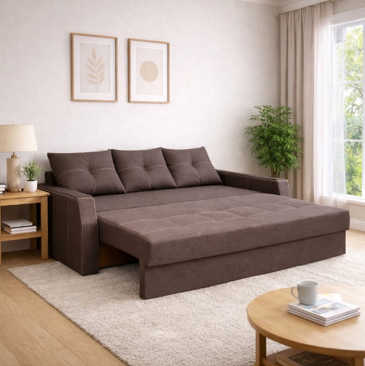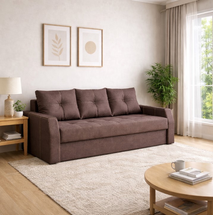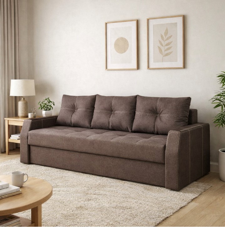 Коли хочеться, щоб у вітальні було затишно, а гості могли залишитися на ніч без зайвих клопотів, багато хто звертає увагу на диван Браво в коричневому виконанні. Це класична єврокнижка, яка поєднує сучасний вигляд і реальну практичність. Коричневий колір додає тепла і добре поєднується з дерев’яними елементами інтер’єру, ламінатом чи теракотовими акцентами.
