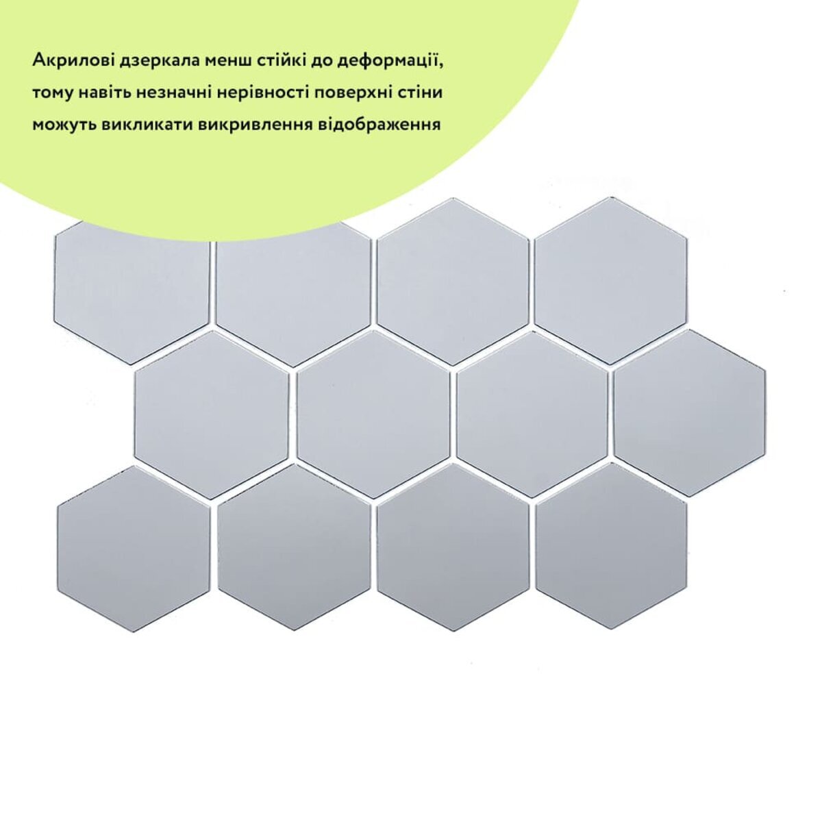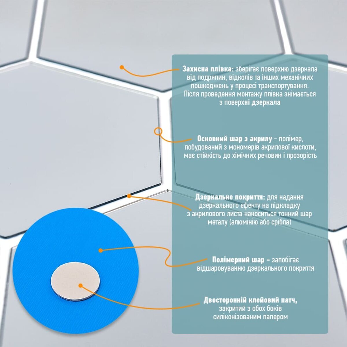 - Дзеркальний шар: це тонке металізоване або полімерне покриття, яке наноситься на акрилову основу та створює ефект дзеркального відбиття. Воно має гладку, світловідбивну поверхню, стійку до вологи та зношування. Завдяки гнучкості матеріалу відображення може незначно викривлюватися.