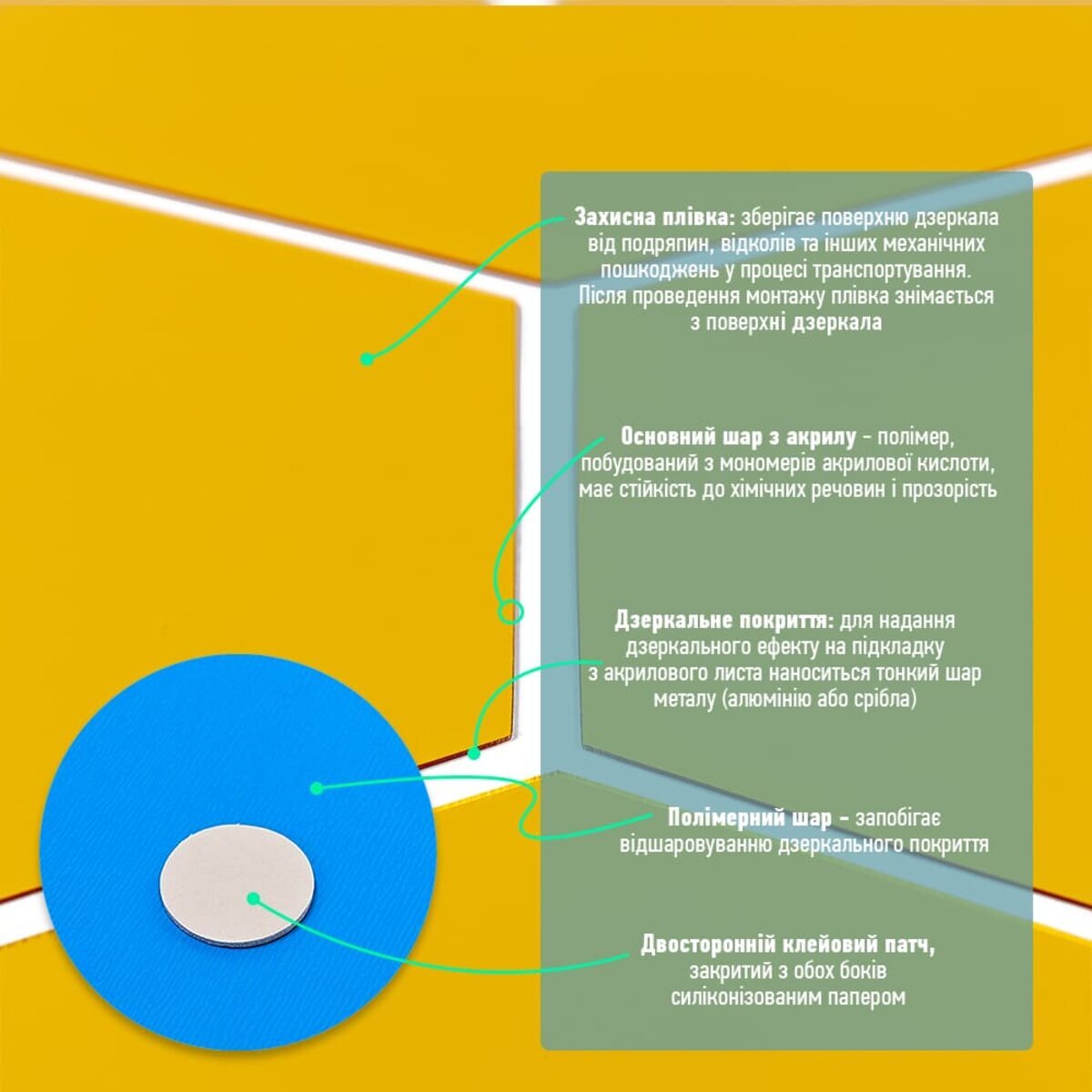 - Дзеркальний шар: це тонке металізоване або полімерне покриття, яке наноситься на акрилову основу та створює ефект дзеркального відбиття. Воно має гладку, світловідбивну поверхню, стійку до вологи та зношування. Завдяки гнучкості матеріалу відображення може незначно викривлюватися.