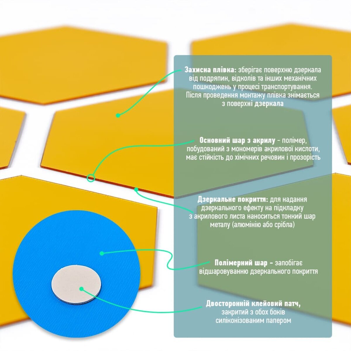 - Дзеркальний шар: це тонке металізоване або полімерне покриття, яке наноситься на акрилову основу та створює ефект дзеркального відбиття. Воно має гладку, світловідбивну поверхню, стійку до вологи та зношування. Завдяки гнучкості матеріалу відображення може незначно викривлюватися.