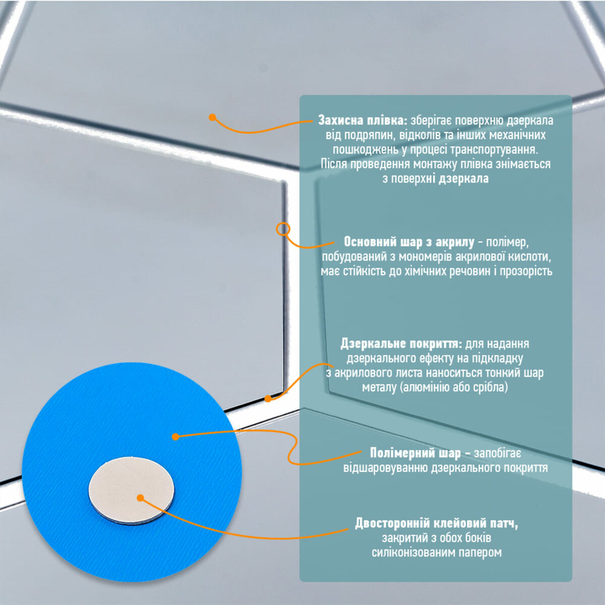 - Дзеркальний шар: це тонке металізоване або полімерне покриття, яке наноситься на акрилову основу та створює ефект дзеркального відбиття. Воно має гладку, світловідбивну поверхню, стійку до вологи та зношування. Завдяки гнучкості матеріалу відображення може незначно викривлюватися.