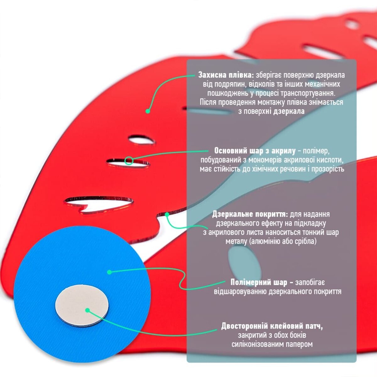 - Дзеркальний шар: це тонке металізоване або полімерне покриття, яке наноситься на акрилову основу та створює ефект дзеркального відбиття. Воно має гладку, світловідбивну поверхню, стійку до вологи та зношування. Завдяки гнучкості матеріалу відображення може незначно викривлюватися.