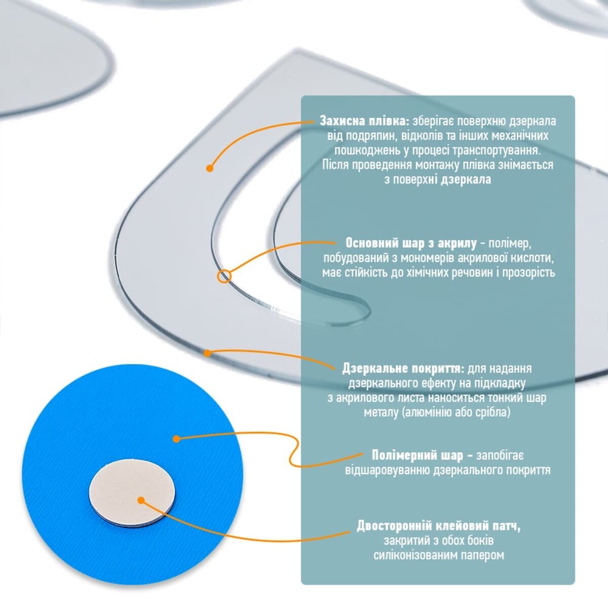 - Дзеркальний шар: це тонке металізоване або полімерне покриття, яке наноситься на акрилову основу та створює ефект дзеркального відбиття. Воно має гладку, світловідбивну поверхню, стійку до вологи та зношування. Завдяки гнучкості матеріалу відображення може незначно викривлюватися.