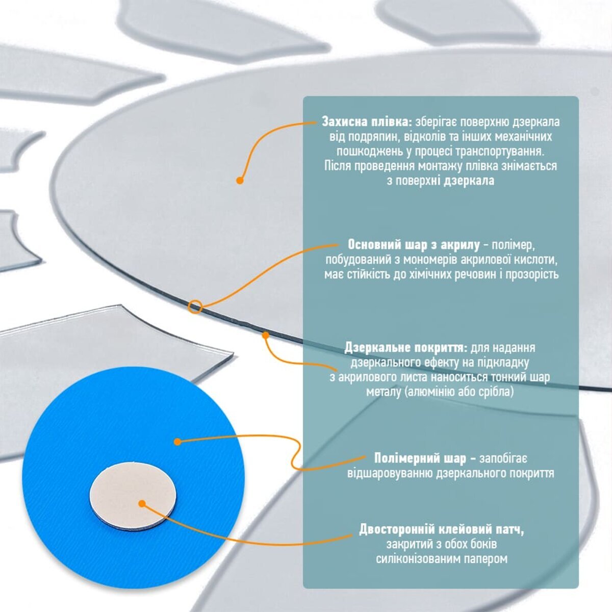 - Дзеркальний шар: це тонке металізоване або полімерне покриття, яке наноситься на акрилову основу та створює ефект дзеркального відбиття. Воно має гладку, світловідбивну поверхню, стійку до вологи та зношування. Завдяки гнучкості матеріалу відображення може незначно викривлюватися.