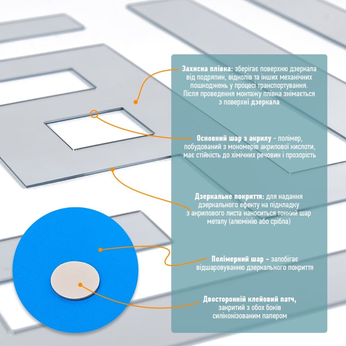- Дзеркальний шар: це тонке металізоване або полімерне покриття, яке наноситься на акрилову основу та створює ефект дзеркального відбиття. Воно має гладку, світловідбивну поверхню, стійку до вологи та зношування. Завдяки гнучкості матеріалу відображення може незначно викривлюватися.