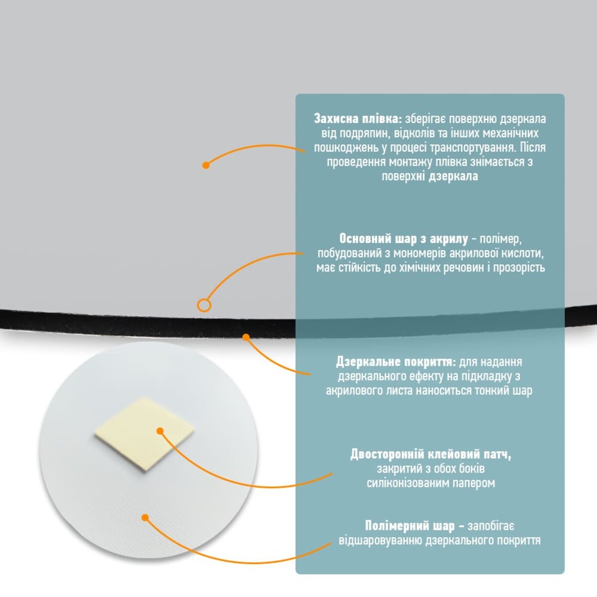 - Захисна плівка: зберігає поверхню дзеркала від подряпин, відколів та інших механічних пошкоджень у процесі транспортування. Після проведення монтажу плівка знімається з поверхні дзеркала.