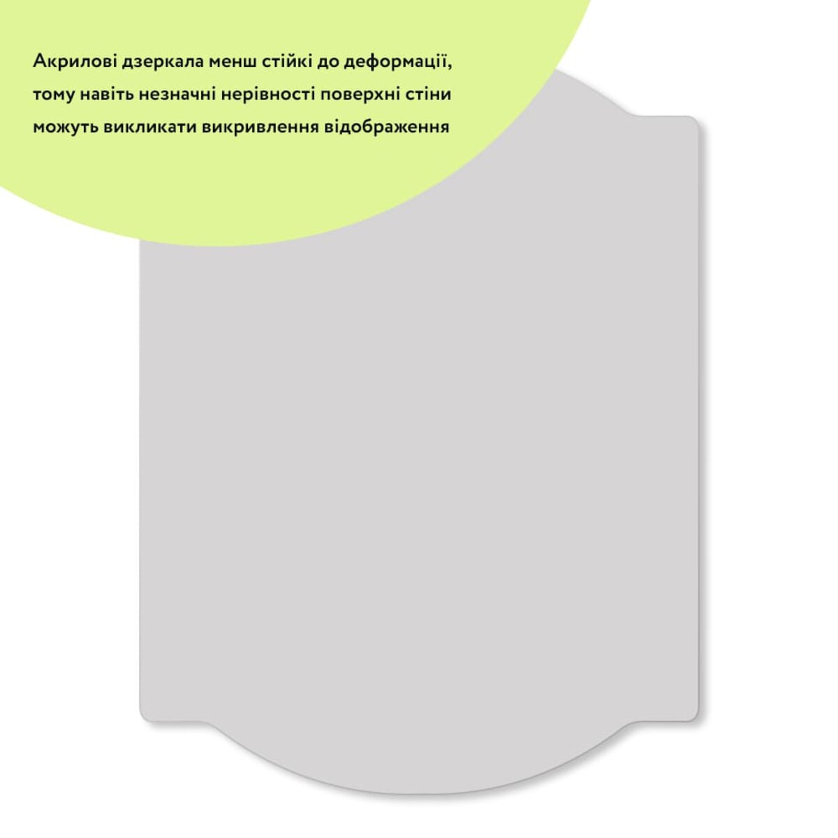 Дзеркало акрилове на клейовій основіАкрилове дзеркало є легким та ударостійким декоративним метеріалом. Виготовляється з високоякісного акрилу, який забезпечує стійкість до пошкоджень. Широко застосовуються в дизайні інтер'єру, виставкових стендах, торговому обладнанні та інших областях, де важливі легкість та безпека матеріалу.