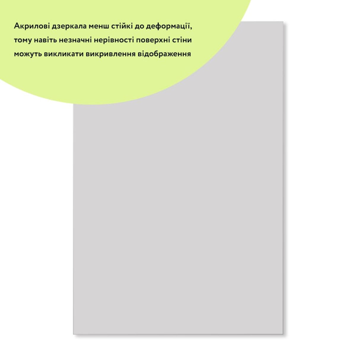 Дзеркало акрилове на клейовій основіАкрилове дзеркало є легким та ударостійким декоративним метеріалом. Виготовляється з високоякісного акрилу, який забезпечує стійкість до пошкоджень. Широко застосовуються в дизайні інтер'єру, виставкових стендах, торговому обладнанні та інших областях, де важливі легкість та безпека матеріалу.