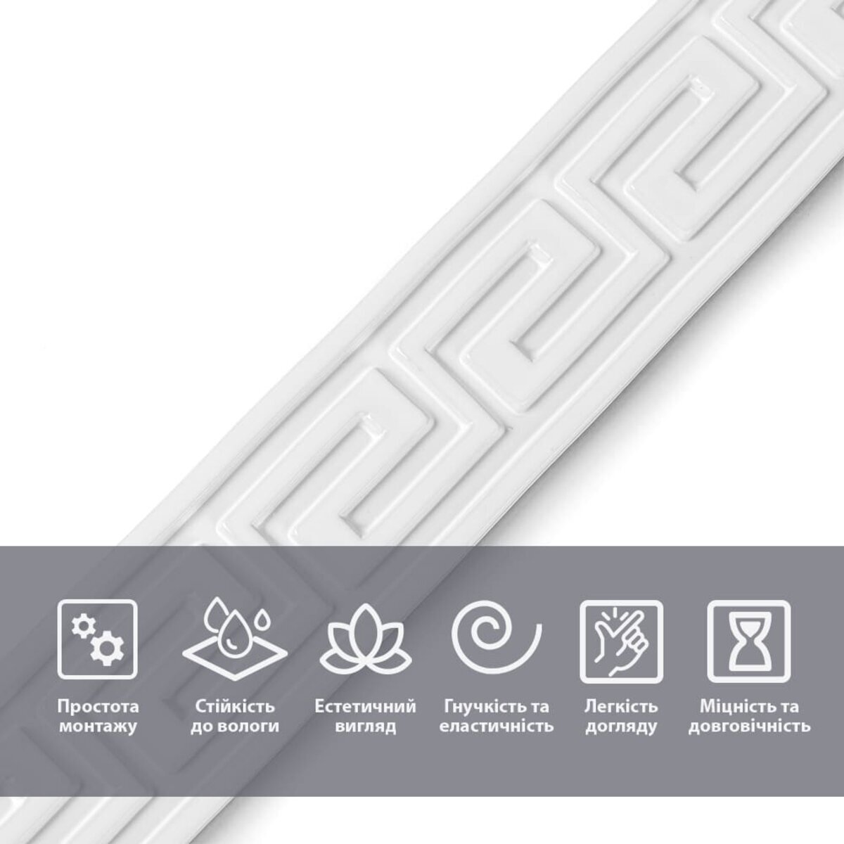 Легкий монтаж: молдинг із клейовою основою просто і швидко встановлюється без потреби в додаткових інструментах чи кріпленнях, що значно економить час і зусилля.Універсальність: підходить для різноманітних поверхонь — стін, стель, дверних і віконних отворів, меблів. Матеріал легко ріжеться та підганяється під потрібний розмір і форму, що забезпечує ідеальне прилягання.Гнучкість та еластичність: завдяки високій гнучкості молдинг щільно повторює контури навіть вигнутих або нерівних поверхонь, не утворюючи складок чи тріщин.Міцність і довговічність: NBR — міцний і зносостійкий матеріал, стійкий до вологи, ультрафіолету та інших агресивних впливів, що гарантує тривалий термін служби без втрати зовнішнього вигляду.Естетичний вигляд: гладка поверхня та чіткі лінії надають інтер’єру акуратності і завершеності. Доступність у кількох універсальних кольорах дозволяє легко підібрати молдинг під будь-який дизайн. Легкість догляду: поверхня молдингу не вбирає пил і бруд, легко очищається звичайними мийними засобами і вологою тканиною, що робить догляд за ним простим і швидким.Інструкція монтажу: