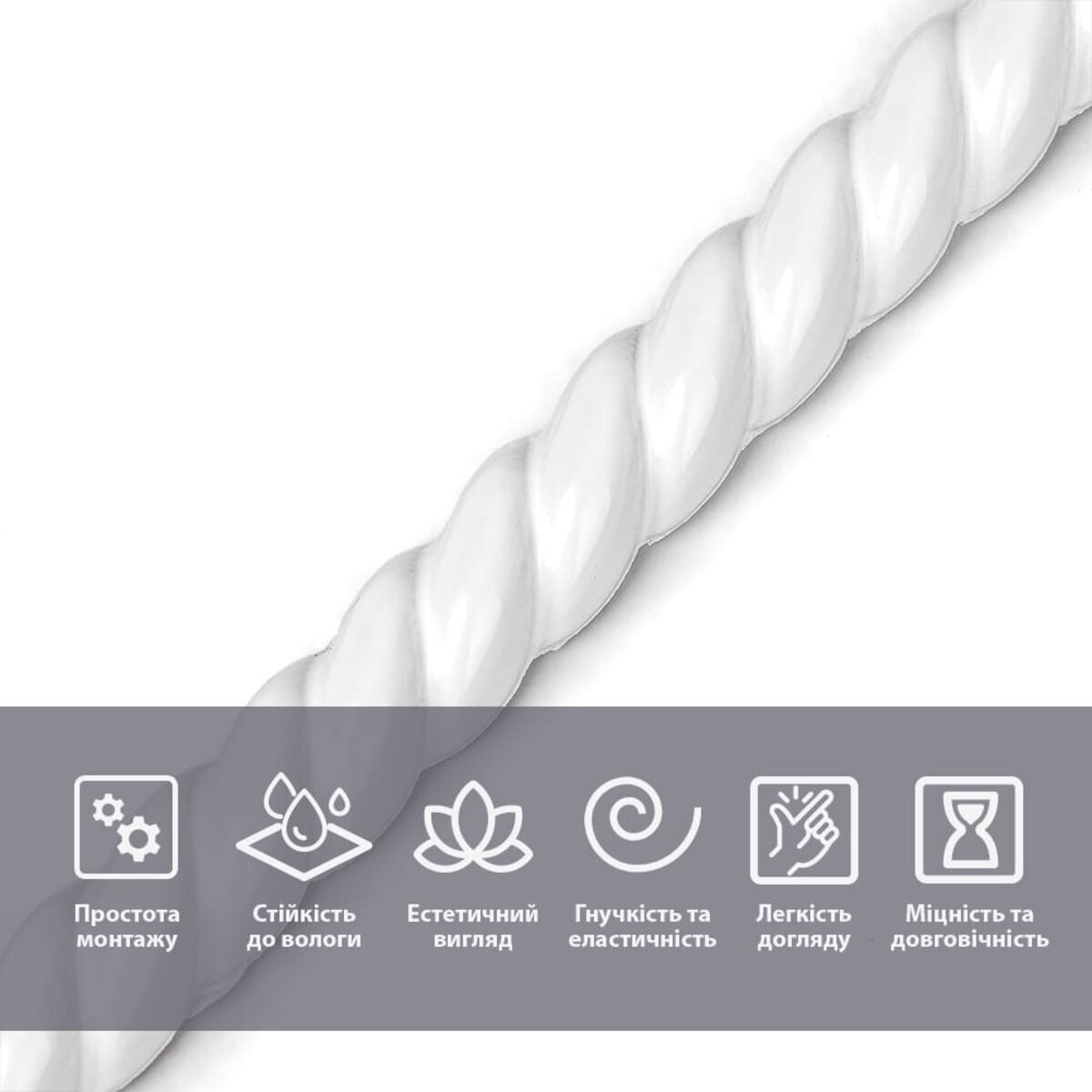 Легкий монтаж: молдинг із клейовою основою просто і швидко встановлюється без потреби в додаткових інструментах чи кріпленнях, що значно економить час і зусилля.Універсальність: підходить для різноманітних поверхонь — стін, стель, дверних і віконних отворів, меблів. Матеріал легко ріжеться та підганяється під потрібний розмір і форму, що забезпечує ідеальне прилягання.Гнучкість та еластичність: завдяки високій гнучкості молдинг щільно повторює контури навіть вигнутих або нерівних поверхонь, не утворюючи складок чи тріщин.Міцність і довговічність: NBR — міцний і зносостійкий матеріал, стійкий до вологи, ультрафіолету та інших агресивних впливів, що гарантує тривалий термін служби без втрати зовнішнього вигляду.Естетичний вигляд: гладка поверхня та чіткі лінії надають інтер’єру акуратності і завершеності. Доступність у кількох універсальних кольорах дозволяє легко підібрати молдинг під будь-який дизайн. Легкість догляду: поверхня молдингу не вбирає пил і бруд, легко очищається звичайними мийними засобами і вологою тканиною, що робить догляд за ним простим і швидким.Інструкція монтажу: