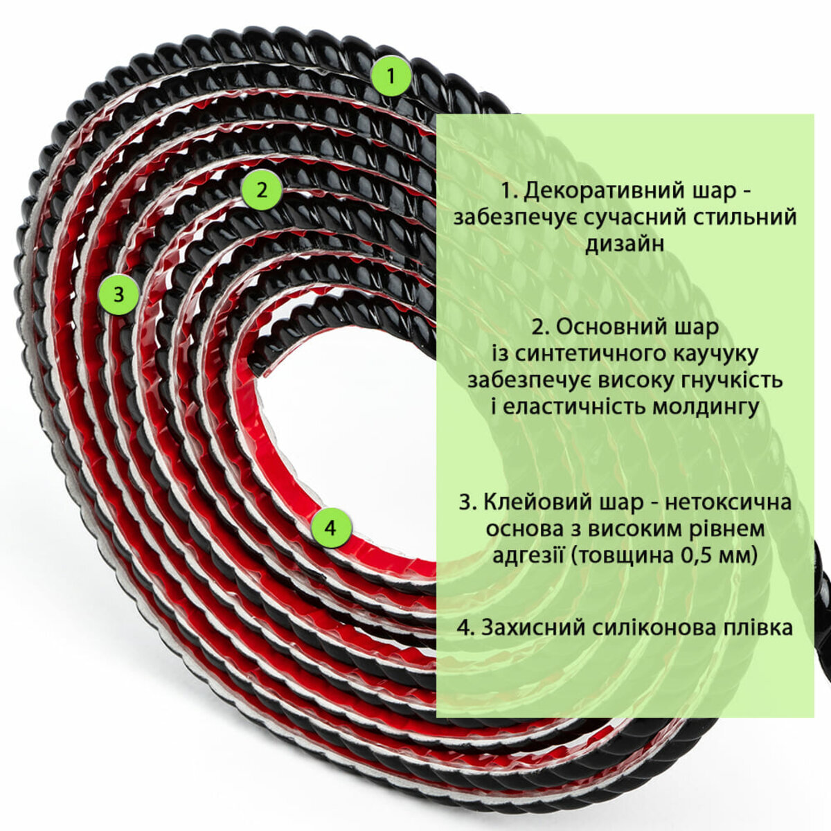 Декоративний шар: відповідає за зовнішній вигляд молдингу — може мати різноманітні фактури та кольори, які забезпечують сучасний стильний дизайн.Основний шар виготовлений із синтетичного каучуку (NBR — нітрил-бутадієновий каучук), забезпечує високу гнучкість і еластичність молдингу, завдяки чому, він легко повторює контури стін, кутів і вигнутих поверхонь без утворення тріщин або деформацій. NBR стійкий до механічних навантажень, стирання, вологи, пару, жиру та більшості побутових хімічних засобів. Завдяки цьому молдинг можна безпечно використовувати навіть у приміщеннях з підвищеною вологістю (ванних, кухнях) або в зонах з активною експлуатацією.Клейовий шар: нетоксична основа з високим рівнем адгезії, що забезпечує надійне прилипання молдингу до різних поверхонь без необхідності додаткових кріплень.Захисна силіконова плівка: оберігає клейовий шар від пересихання і забруднення до моменту монтажу, легко знімається під час встановлення.Основні переваги молдингів на клейовій основі: