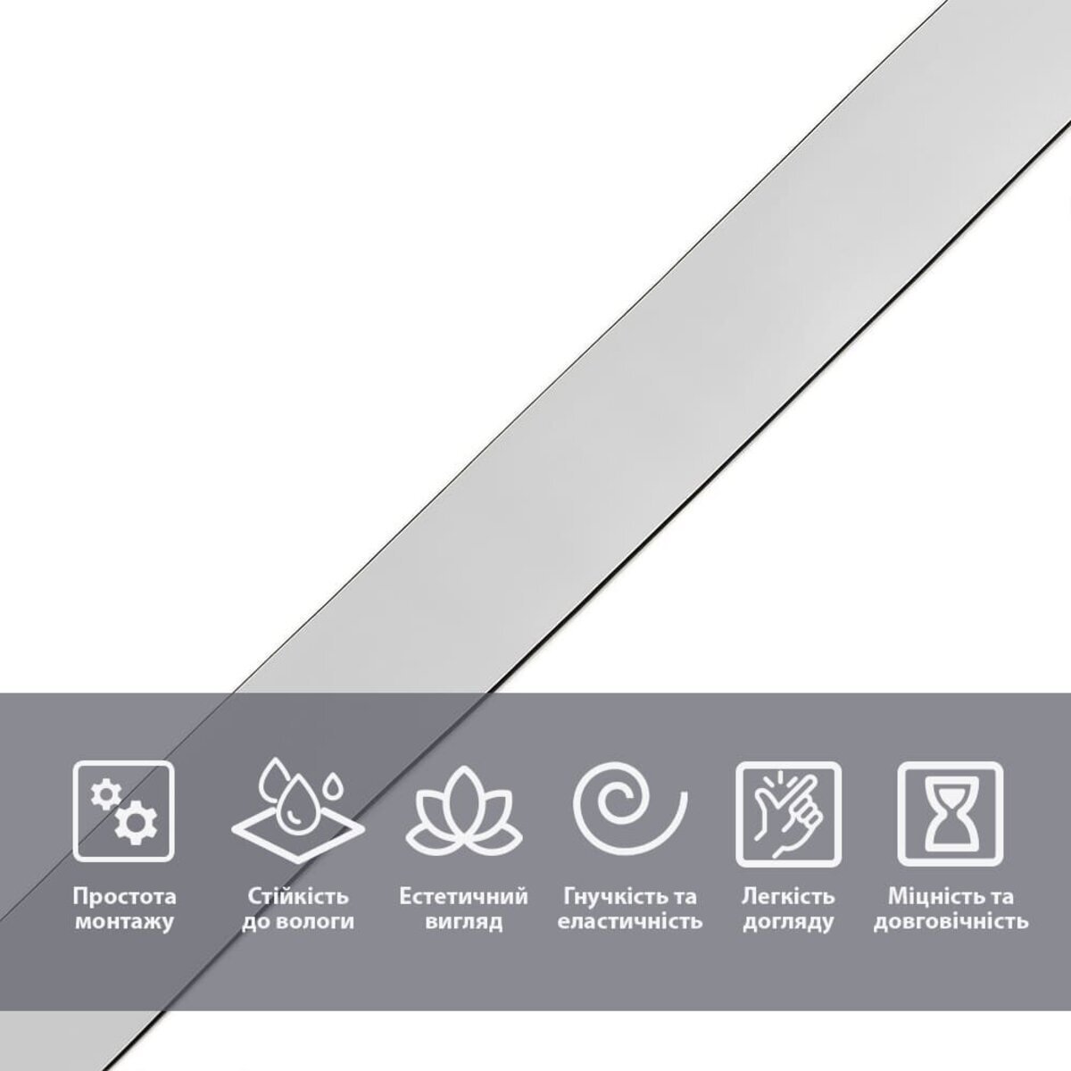 Легкий монтаж: молдинг з клейовою основою просто і швидко встановлюється без необхідності в додаткових інструментах або кріпленнях, що значно заощаджує час та зусилля.Універсальність: підходить для різних поверхонь – стін, стель, дверних та віконних отворів, меблів. Матеріал легко ріжеться та підганяється під потрібний розмір та форму, що забезпечує ідеальне прилягання.Гнучкість та еластичність: завдяки високій гнучкості молдинг щільно повторює контури навіть вигнутих чи нерівних поверхонь, не утворюючи складок чи тріщин.Міцність та довговічність: NBR — міцний та зносостійкий матеріал, стійкий до вологи, ультрафіолету та інших агресивних впливів, що гарантує тривалий термін служби без втрати зовнішнього вигляду.Естетичний вигляд: гладка поверхня та чіткі лінії надають інтер'єру акуратності та завершеності. Доступність у кількох універсальних кольорах дозволяє легко підібрати молдинг під будь-який дизайн. Легкість догляду: поверхня молдингу не вбирає пил та бруд, легко очищається звичайними миючими засобами та вологою тканиною, що робить догляд за ним простим та швидким.Інструкція з монтажу: