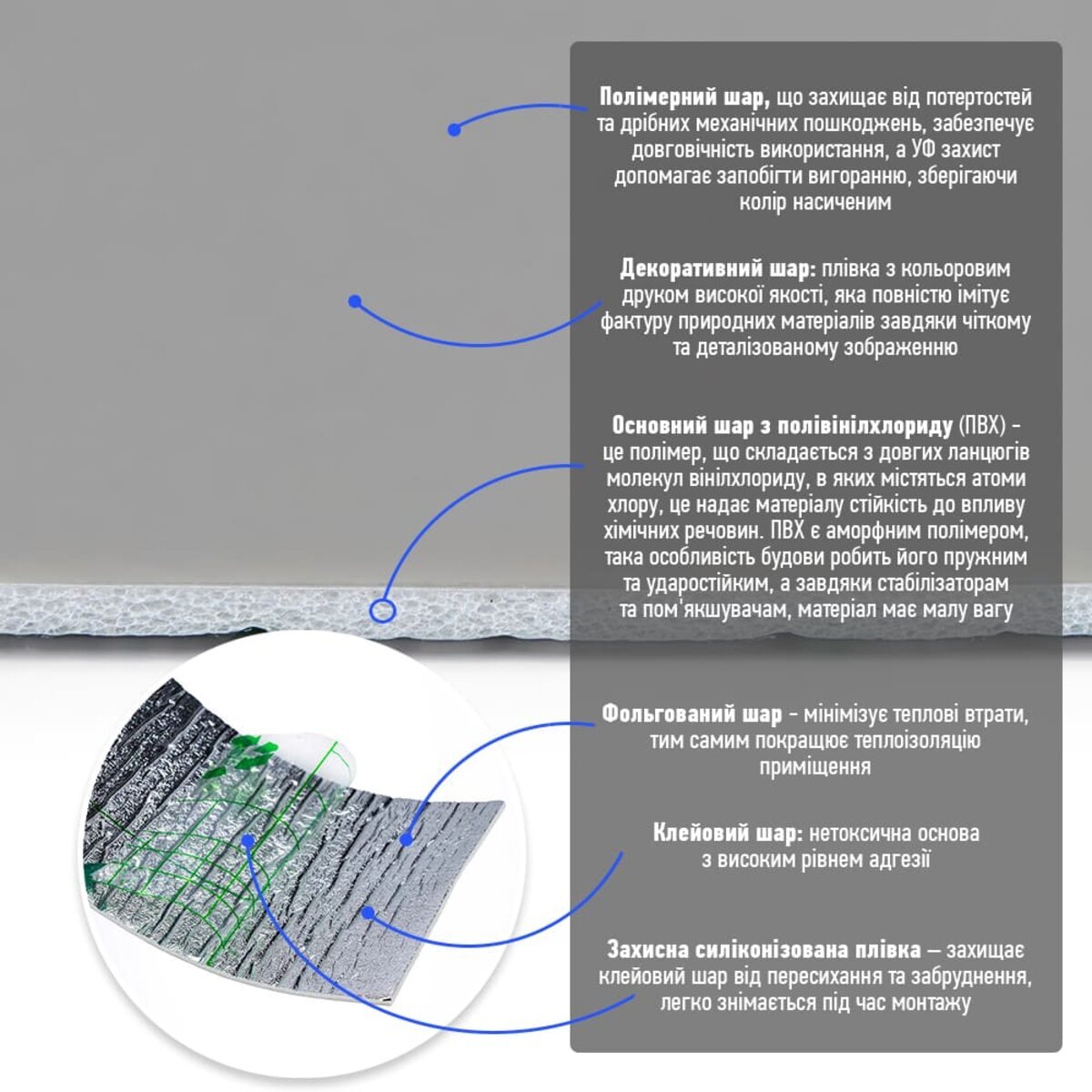 - Декоративний шар: плівка з кольоровим друком високої якості, яка повністю імітує фактуру природних матеріалів завдяки чіткому та деталізованому зображенню.