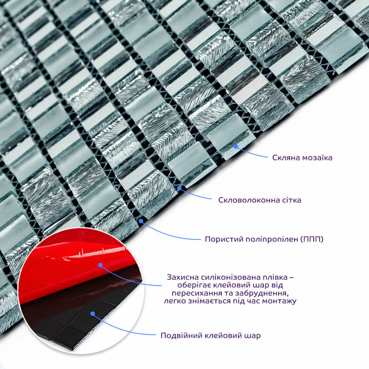 Скляна мозаїка – маленька квадратна часточка (тессер), виготовлених із міцного, прозорого скла. Сітка. Кожен шматочок мозаїки, прикріплений до основи з полімерної або скловолоконної сітки що дозволяє легко монтувати всю плитку як цілісне покриття.Пористий поліпропілен (ППП) – це термопластичний полімер, його структура включає повторювані молекулярні одиниці пропілену. Він має пористу структуру, завдяки чому має гарну термоізоляцію і низьку щільність, а відповідно і малу вагу. Пористий поліпропілен також стійкий до вологи та хімічно інертний.Подвійний клейовий шар: нетоксична основа з високим рівнем адгезії.Захисна силіконова плівка – оберігає клейовий шар від пересихання та забруднення, легко знімається під час монтажу.Основні переваги скляної мозаїки: