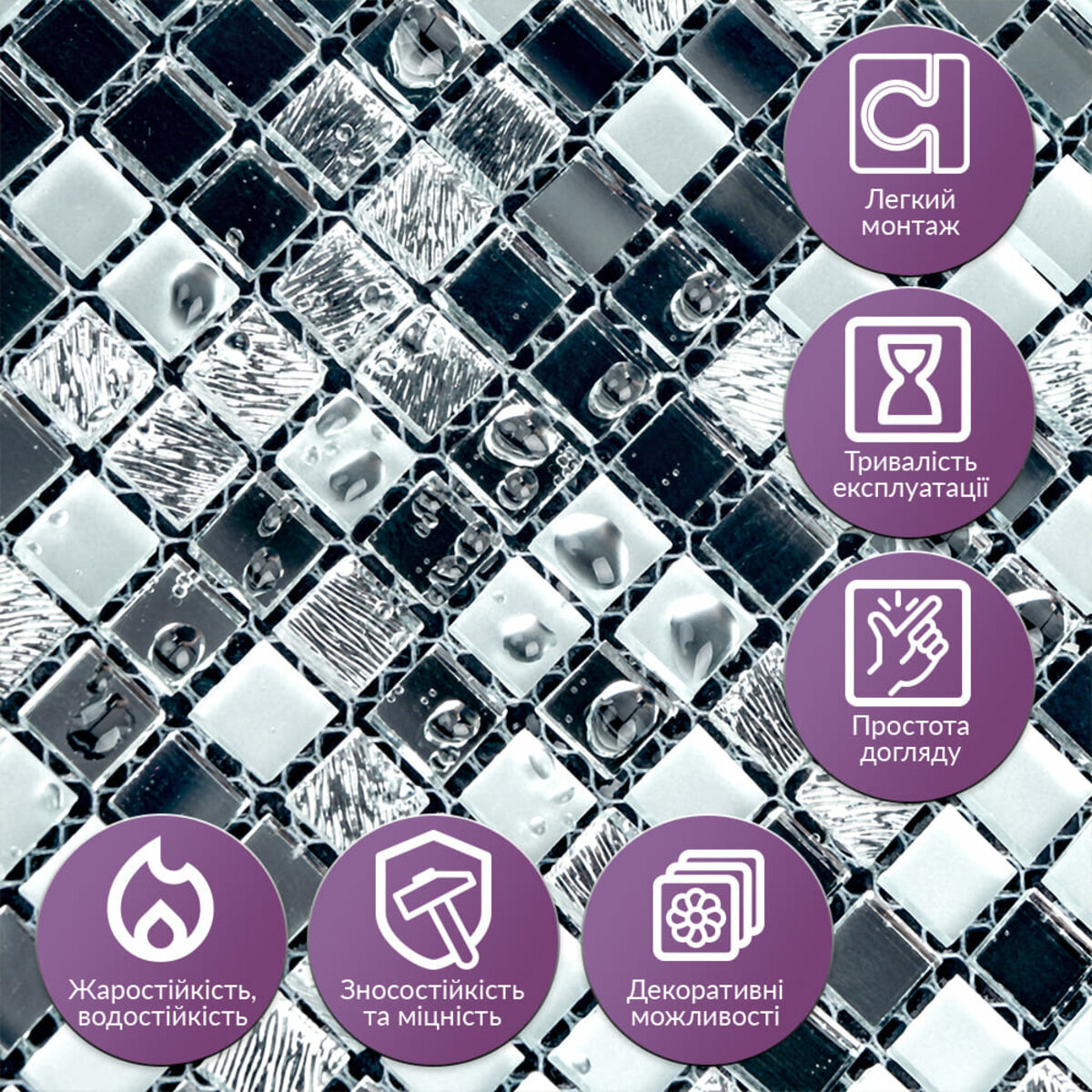 Легкий монтаж: Завдяки самоклеючій основі мозаїку легко встановити на будь-яку рівну поверхню без потреби у спеціальних інструментах. Міцна фіксація забезпечує стійке кріплення, що дозволяє уникнути переміщення фрагментів при монтажі. Водостійкість та жаростійкість: Скляна мозаїка на клейовій основі стійка до впливу вологи та температурних перепадів, що робить її ідеальним вибором для ванних кімнат, кухонь і душових кабін. Покриття запобігає утворенню плісняви, забезпечуючи довговічність та безпеку використання у вологих приміщеннях.Міцність та зносостійкість: Завдяки високоякісному склу та інноваційній технології обробки кожна частинка мозаїки має високу стійкість до подряпин і механічних пошкоджень. Це забезпечує довгий термін служби, навіть за умови інтенсивного використання.Декоративні можливості: скляна плитка доступна в різних кольорах та дизайнах. Це дозволяє вибрати плитку, яка найкраще підійде до інтер'єру вашого приміщення. Якісна альтернатива кахлю чи керамічній плитці.Простота догляду: Мозаїка легко миється і не потребує спеціальних засобів для очищення, що спрощує її підтримання у належному стані. Вона не вбирає бруд і залишається чистою навіть у приміщеннях з високою вологістю та частим використанням.Рекомендації щодо догляду: