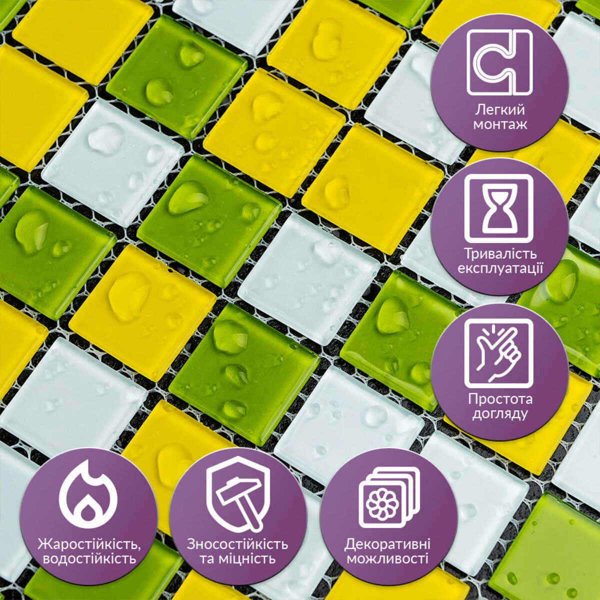 Характеристики - Мозаїка з декоративного скла 298х298х4,5мм Жовто-зелена SW-00002362
