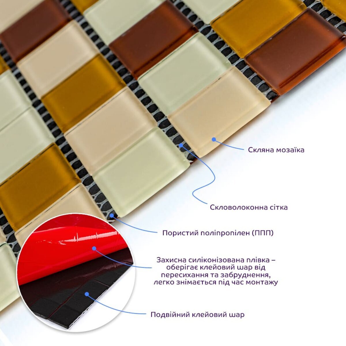 Скляна мозаїка – маленька квадратна часточка (тессер), виготовлених із міцного, прозорого скла. Сітка. Кожен шматочок мозаїки, прикріплений до основи з полімерної або скловолоконної сітки що дозволяє легко монтувати всю плитку як цілісне покриття.Пористий поліпропілен (ППП) – це термопластичний полімер, його структура включає повторювані молекулярні одиниці пропілену. Він має пористу структуру, завдяки чому має гарну термоізоляцію і низьку щільність, а відповідно і малу вагу. Пористий поліпропілен також стійкий до вологи та хімічно інертний.Подвійний клейовий шар: нетоксична основа з високим рівнем адгезії.Захисна силіконова плівка – оберігає клейовий шар від пересихання та забруднення, легко знімається під час монтажу.Основні переваги скляної мозаїки: