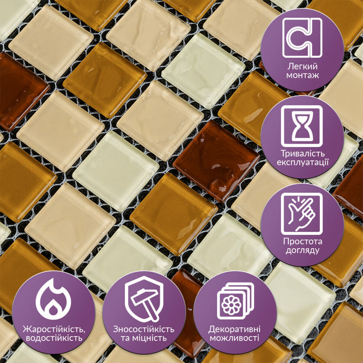 Легкий монтаж: Завдяки самоклеючій основі мозаїку легко встановити на будь-яку рівну поверхню без потреби у спеціальних інструментах. Міцна фіксація забезпечує стійке кріплення, що дозволяє уникнути переміщення фрагментів при монтажі. Водостійкість та жаростійкість: Скляна мозаїка на клейовій основі стійка до впливу вологи та температурних перепадів, що робить її ідеальним вибором для ванних кімнат, кухонь і душових кабін. Покриття запобігає утворенню плісняви, забезпечуючи довговічність та безпеку використання у вологих приміщеннях.Міцність та зносостійкість: Завдяки високоякісному склу та інноваційній технології обробки кожна частинка мозаїки має високу стійкість до подряпин і механічних пошкоджень. Це забезпечує довгий термін служби, навіть за умови інтенсивного використання.Декоративні можливості: скляна плитка доступна в різних кольорах та дизайнах. Це дозволяє вибрати плитку, яка найкраще підійде до інтер'єру вашого приміщення. Якісна альтернатива кахлю чи керамічній плитці.Простота догляду: Мозаїка легко миється і не потребує спеціальних засобів для очищення, що спрощує її підтримання у належному стані. Вона не вбирає бруд і залишається чистою навіть у приміщеннях з високою вологістю та частим використанням.Рекомендації щодо догляду: