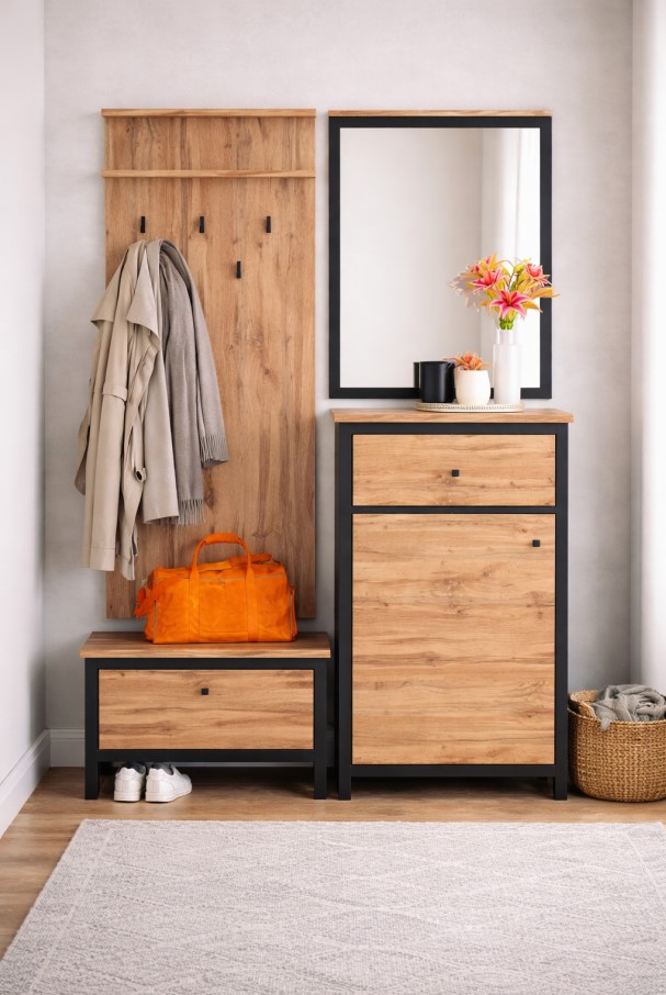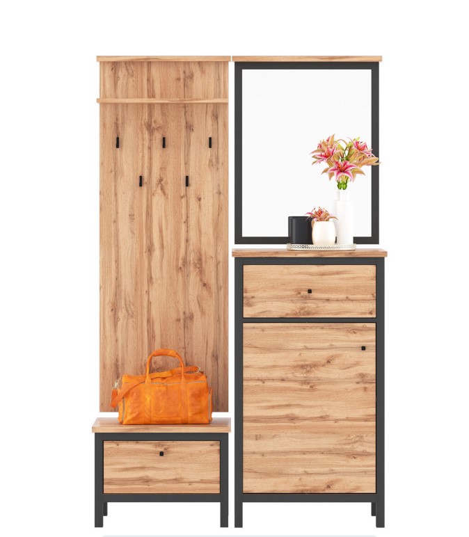 Сучасний лаконічний дизайн із поєднанням теплого деревного декору та контрастних акцентів надає передпокою стильного вигляду та візуально впорядковує простір. Передпокій Чос №2 гармонійно вписується в інтер’єри різних стилів і може доповнюватися іншими модулями системи для створення цілісної та практичної композиції.