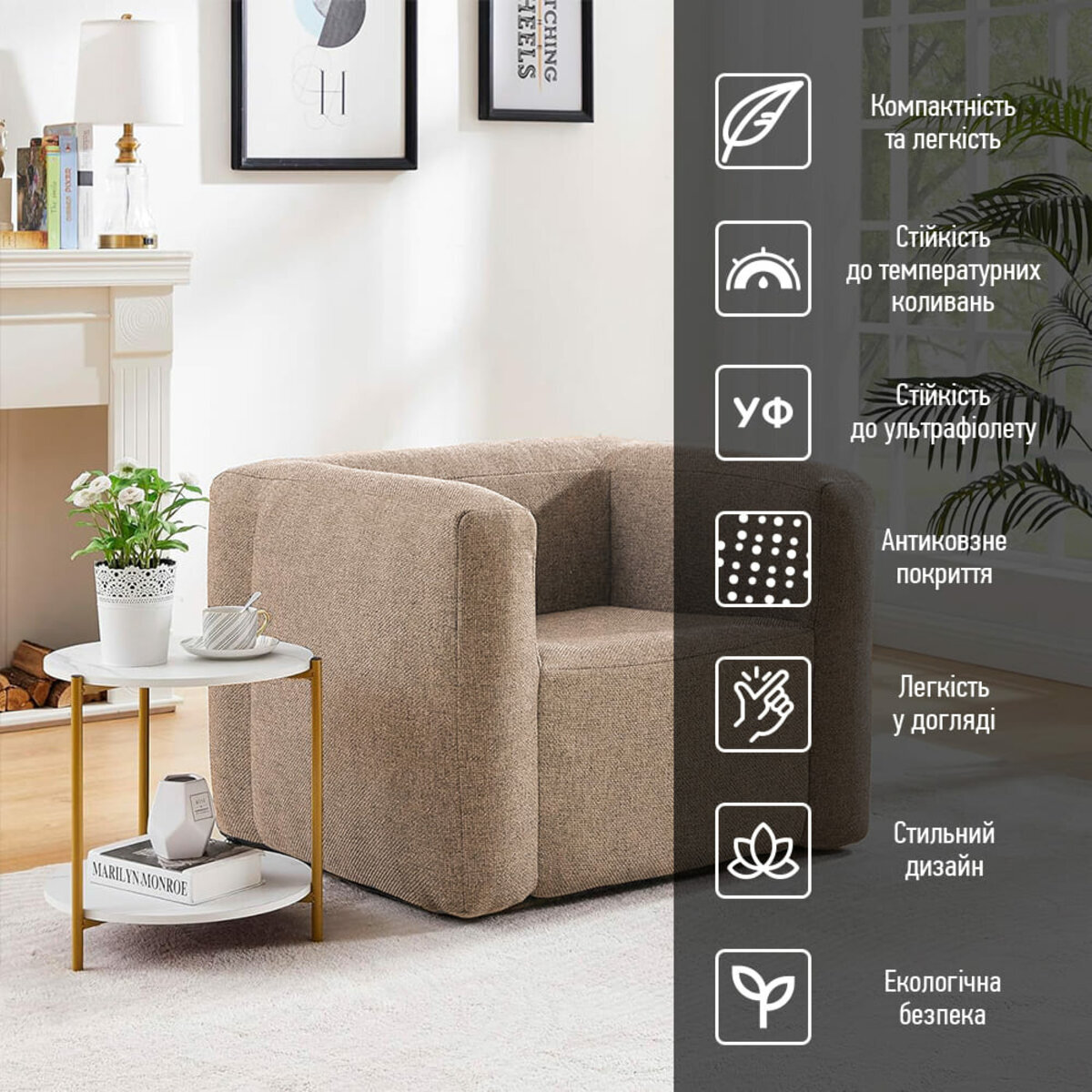 Пропонуємо вашій увазі надувні меблі, які поєднують сучасний дизайн та практичність. Основу меблів виготовлено зі зносостійкого поліуретану, а верхнє покриття — із поліестерової мішковини, що вирізняється приємною текстурою та стійкістю до пошкоджень. На відміну від звичайних меблів, надувні значно легші у транспортуванні: у спущеному вигляді вони займають мінімум місця, що є ідеальним рішенням для переїздів або зміни інтер’єру.