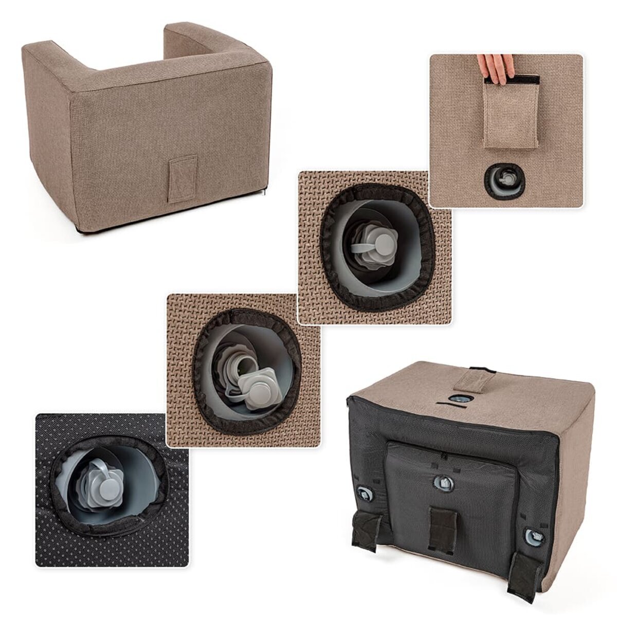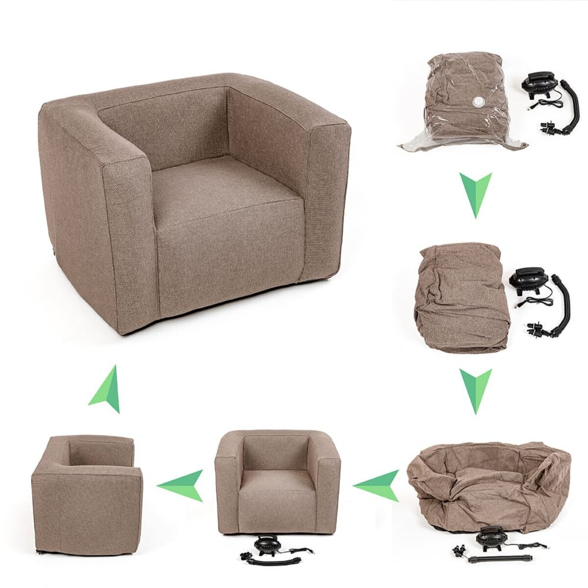 - Зберігання: Після використання надувні меблі потрібно здути для зручності зберігання. Зберігайте меблі в сухому, добре вентильованому приміщенні. Для додаткового захисту від пилу та пошкоджень покладіть меблі в компресійний пакет.