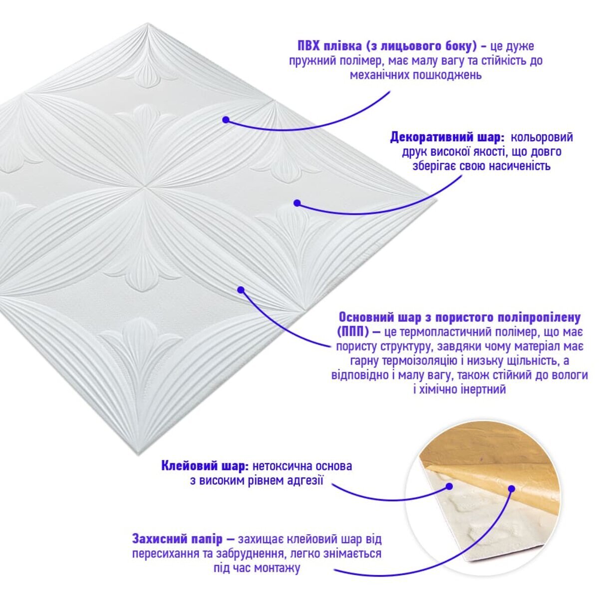 - Захисний папір – оберігає клейовий шар від пересихання та забруднення, легко знімається під час монтажу.