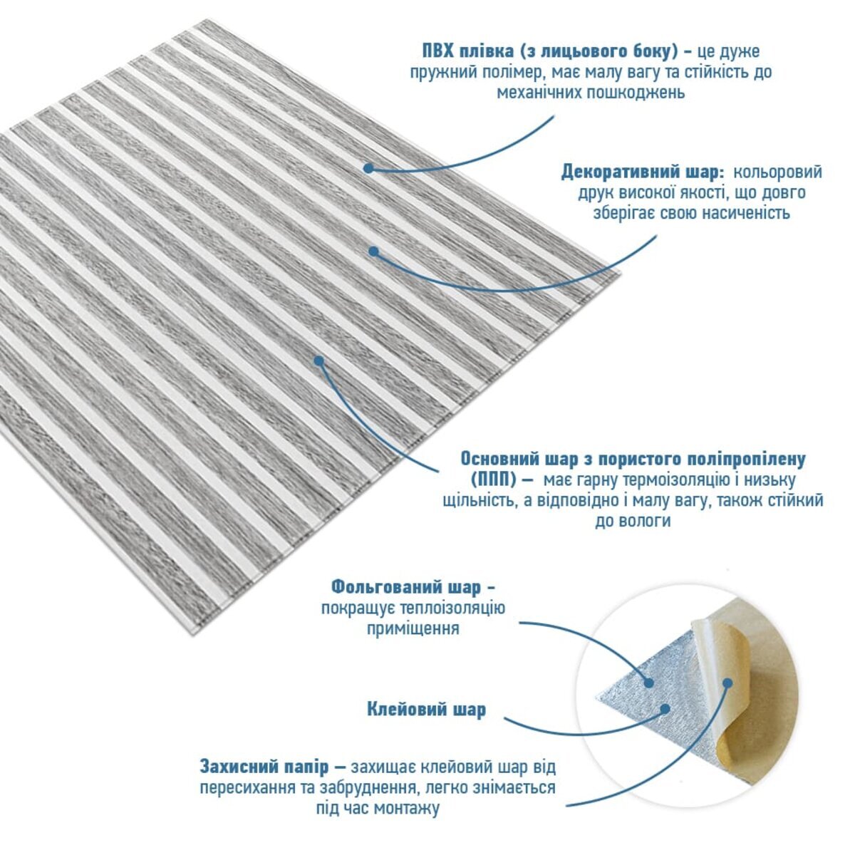 - Захисний папір – оберігає клейовий шар від пересихання та забруднення, легко знімається під час монтажу.