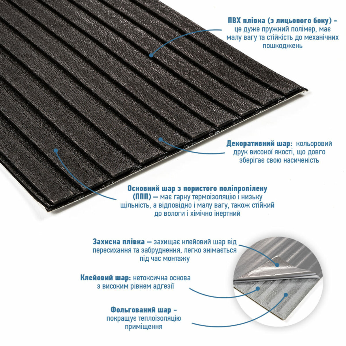 - Захисний папір – оберігає клейовий шар від пересихання та забруднення, легко знімається під час монтажу.