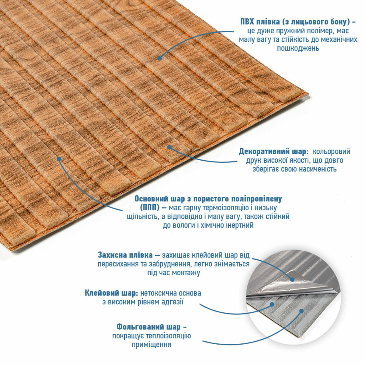 - Декоративний шар: кольоровий друк високої якості, що довго зберігає свою насиченість.