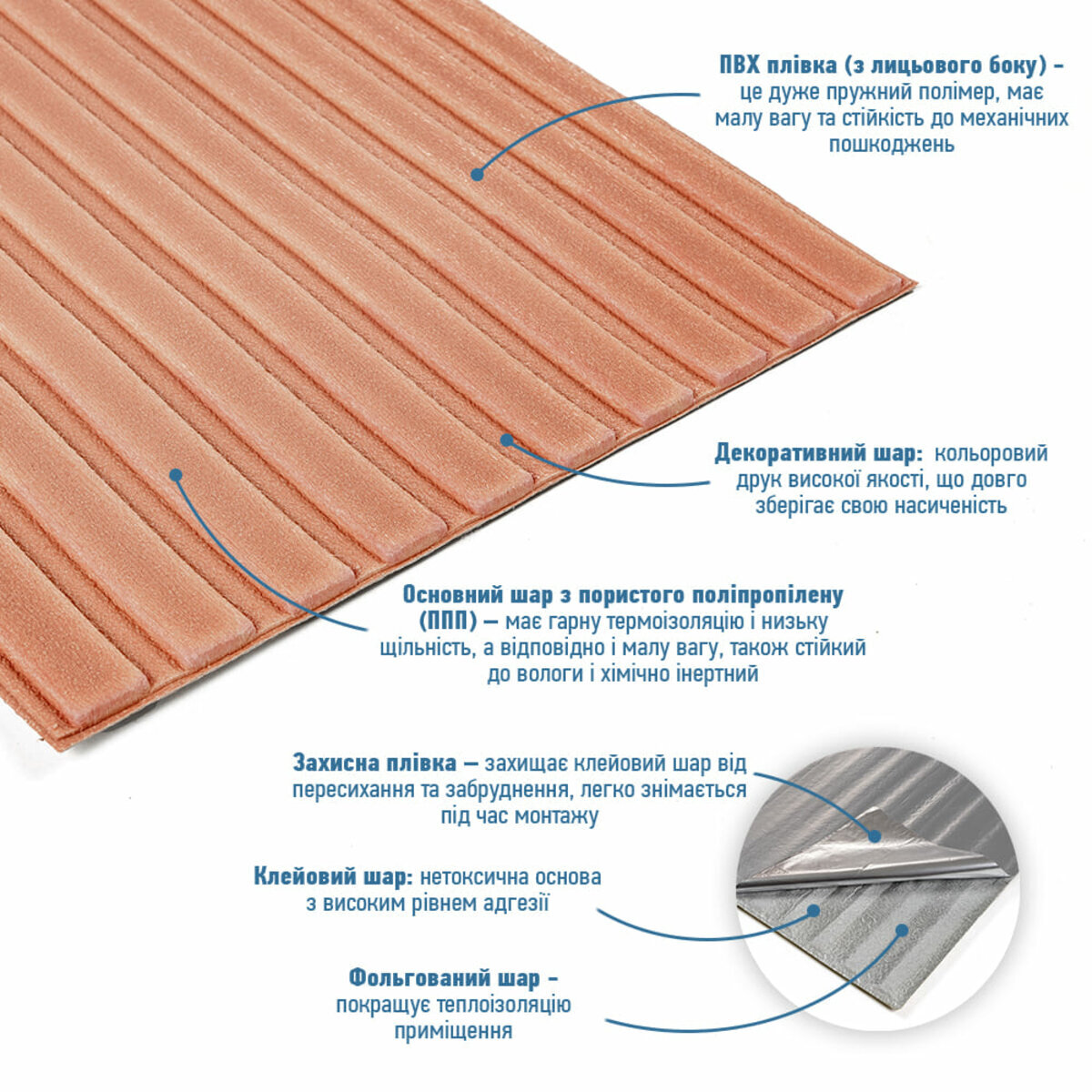 - Захисний папір – оберігає клейовий шар від пересихання та забруднення, легко знімається під час монтажу.