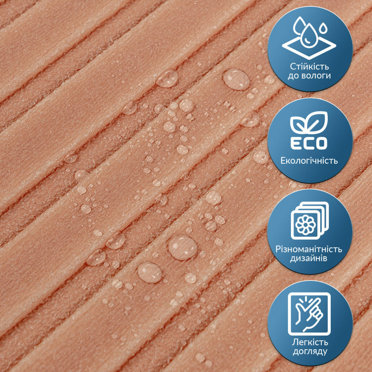 - Стійкість до води та хімічних речовин: пористий поліпропілен має гарну стійкість до вологи, це дає можливість застосовувати його у приміщеннях з підвищеною вологістю, а завдяки захисній ПВХ плівці, панель можна мити побутовими миючими засобами (без використання щітки з високою абразивною здатністю).