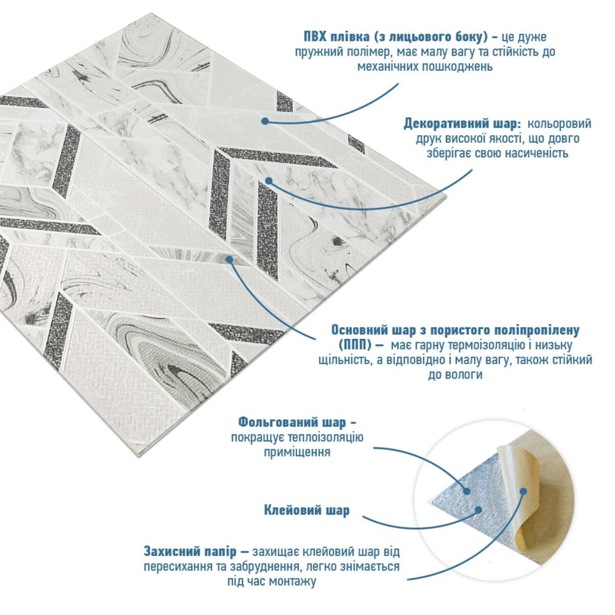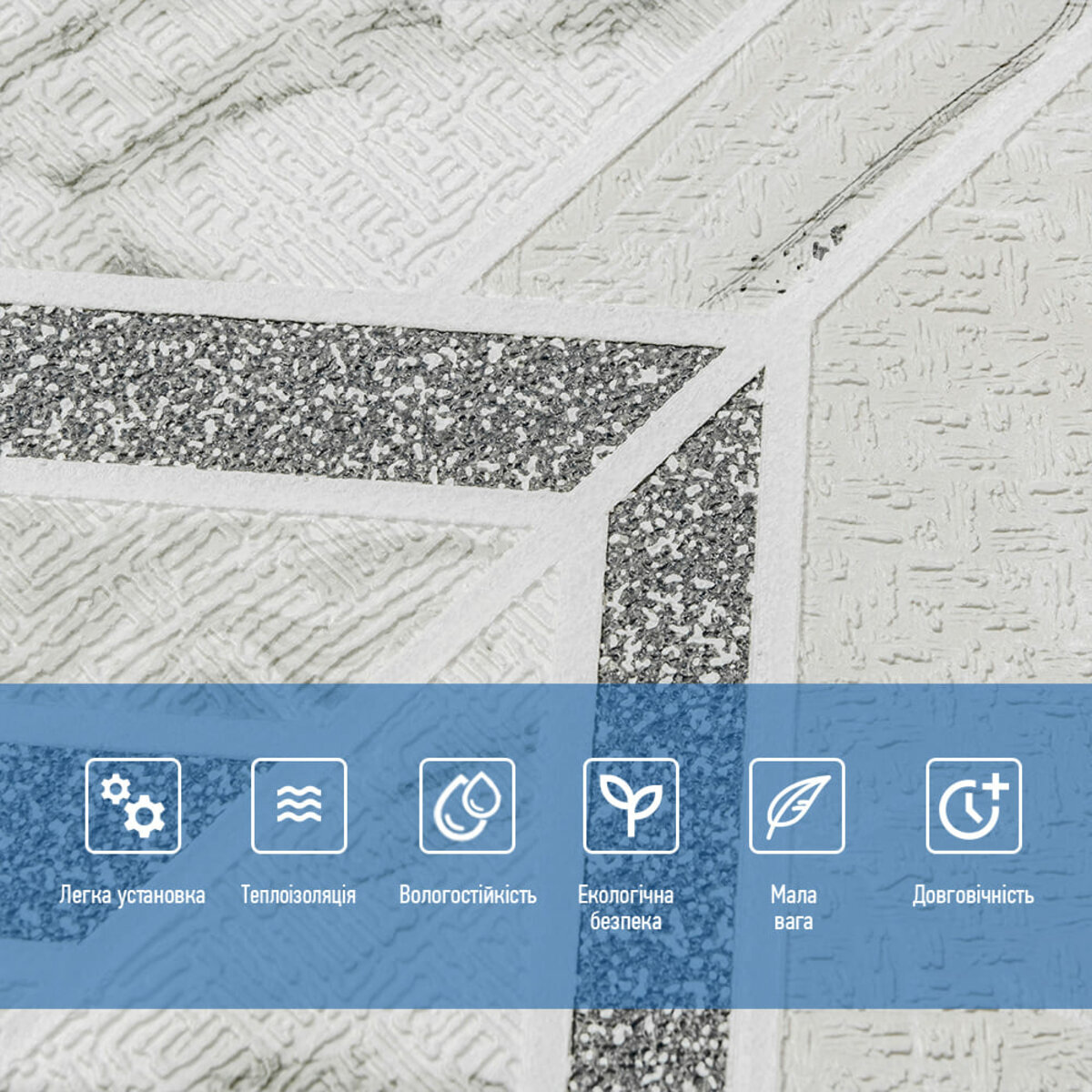 - Легкість монтажу: наявність клейового шару дозволяє встановити панелі без необхідності застосування додаткових матеріалів.