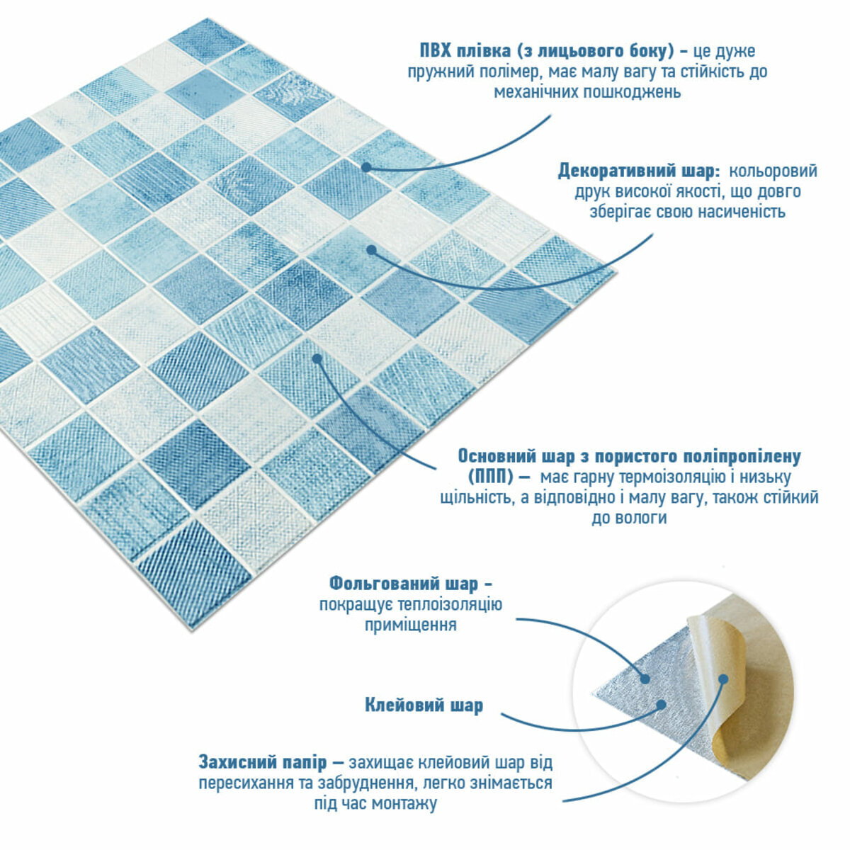 - Захисний папір – оберігає клейовий шар від пересихання та забруднення, легко знімається під час монтажу.