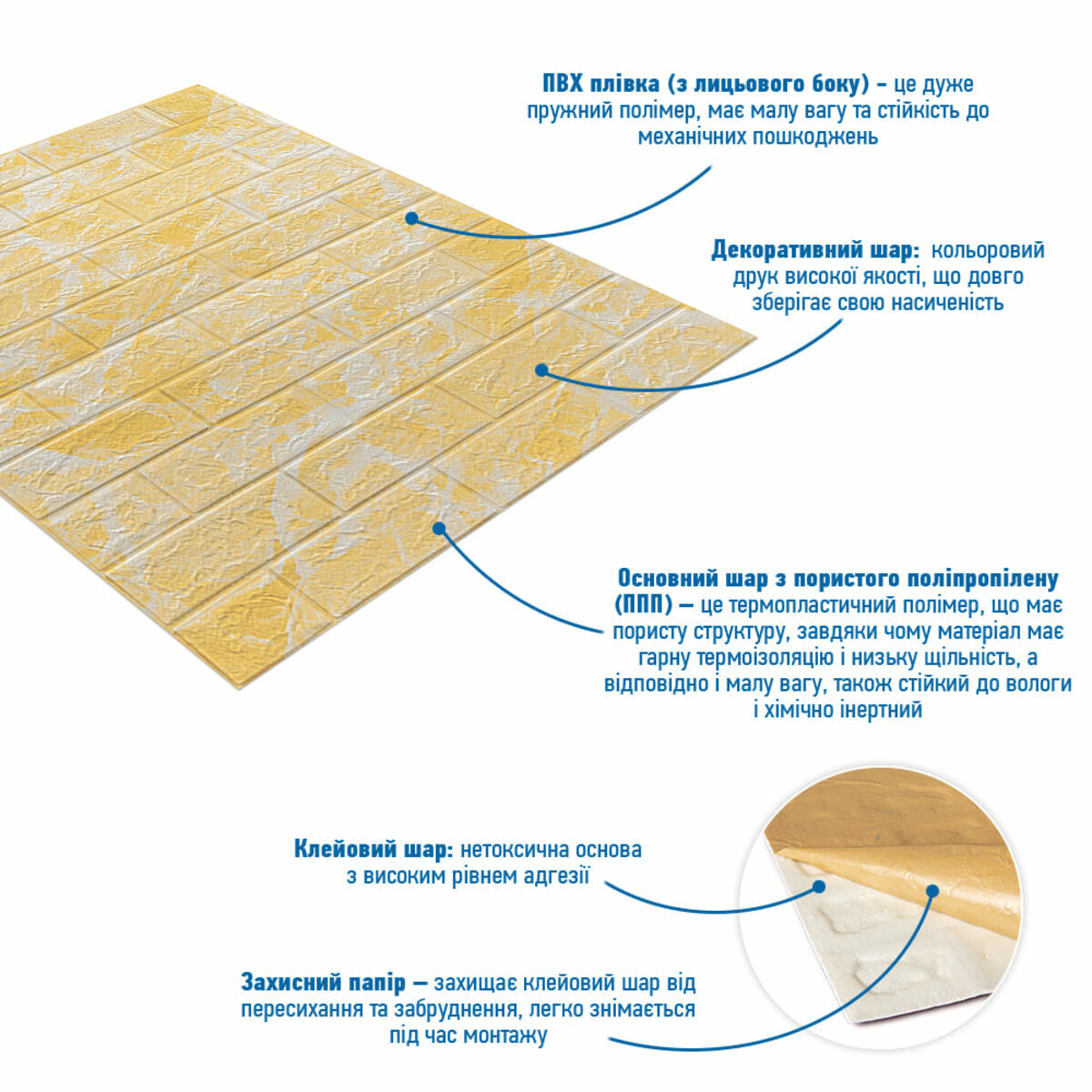 - Захисний папір – оберігає клейовий шар від пересихання та забруднення, легко знімається під час монтажу.
