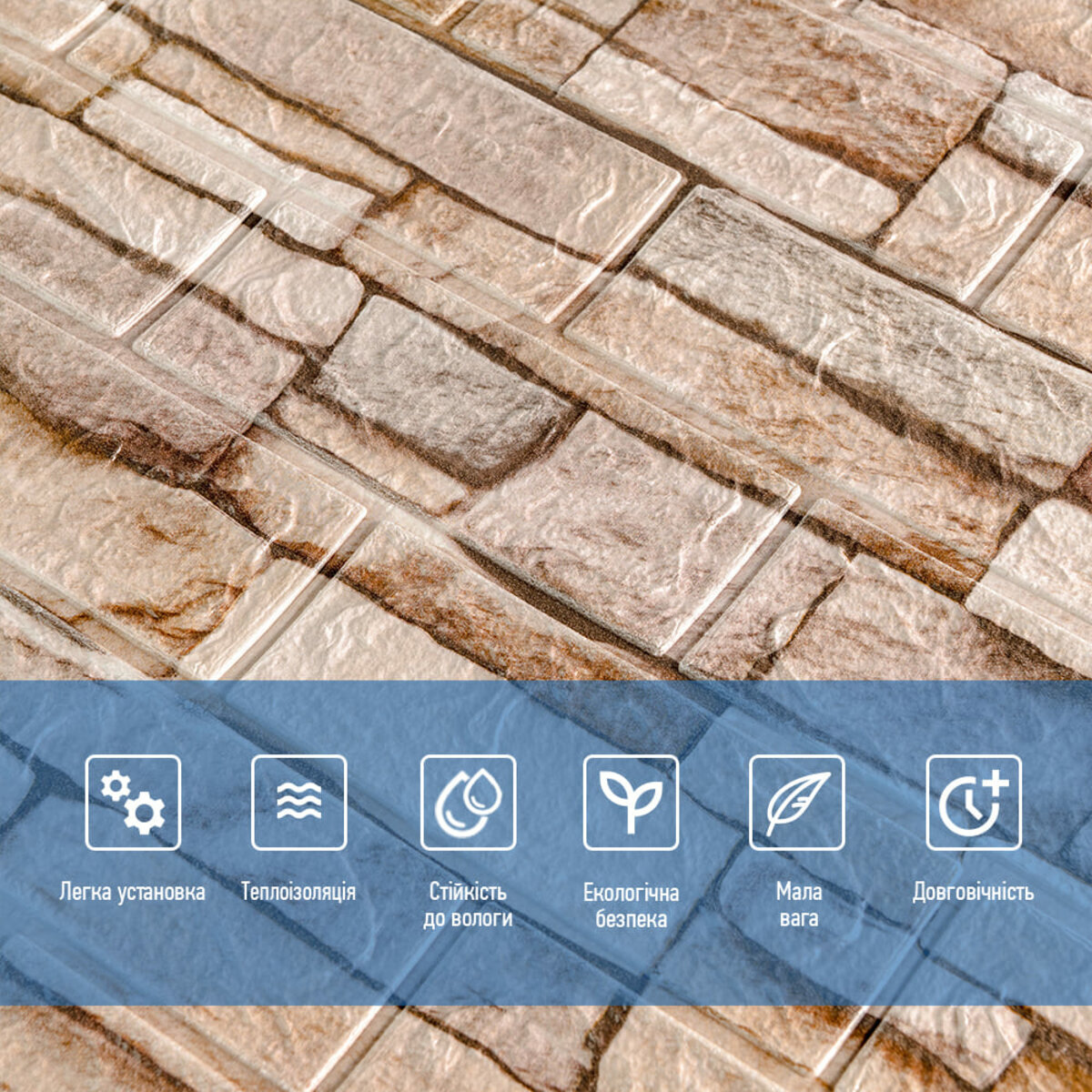 3D панелі самоклеючі – декоративне покриття для стін, виконане з легкого та міцного матеріалу – пористого поліпропілену (ППП). Основна особливість – рельєфний малюнок у вигляді цегли у широкому різноманітті кольорів та наявність клейового шару, що дозволяє встановити панелі без необхідності застосування додаткових матеріалів.