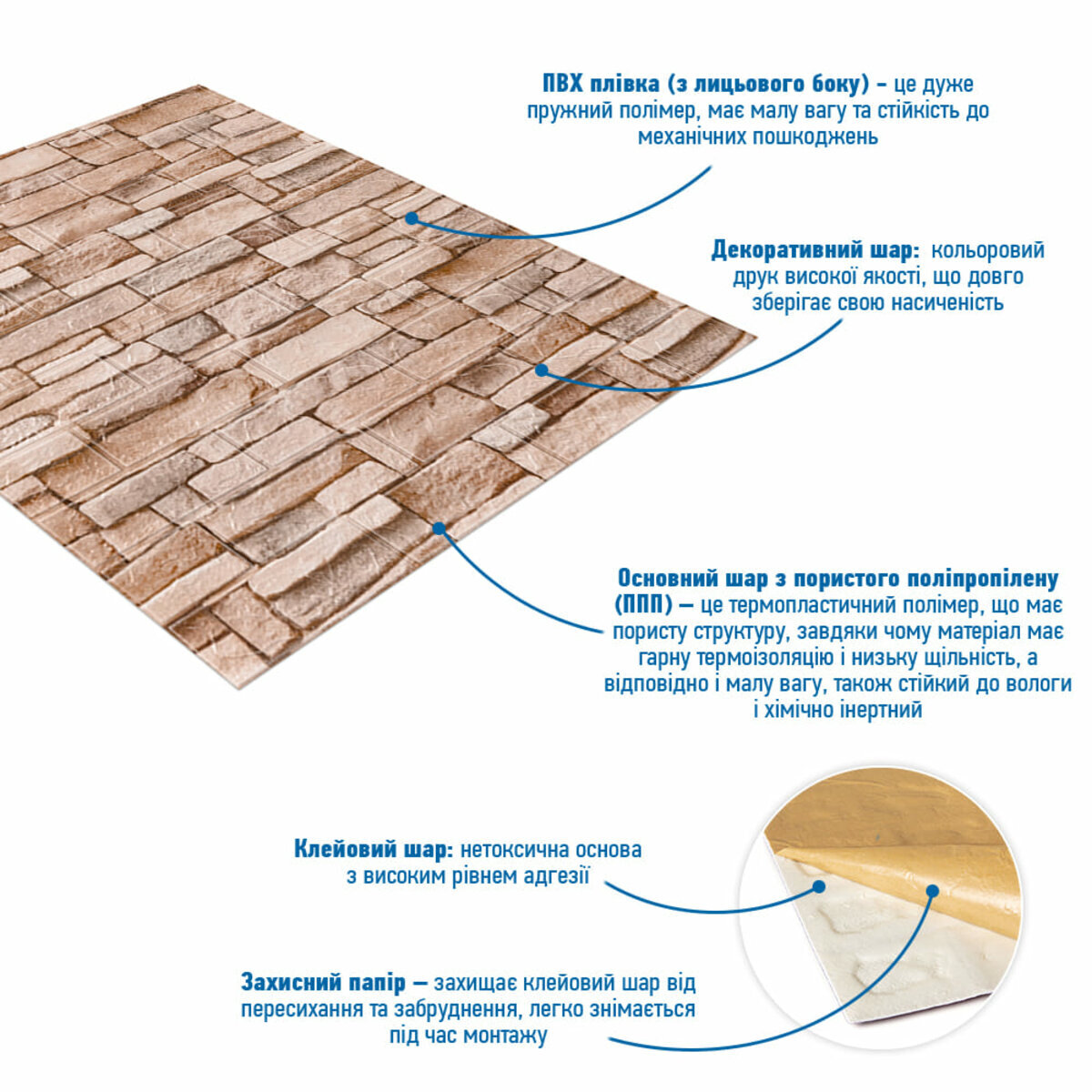 - Легкість монтажу: наявність клейового шару дозволяє встановити панелі без необхідності застосування додаткових матеріалів.
